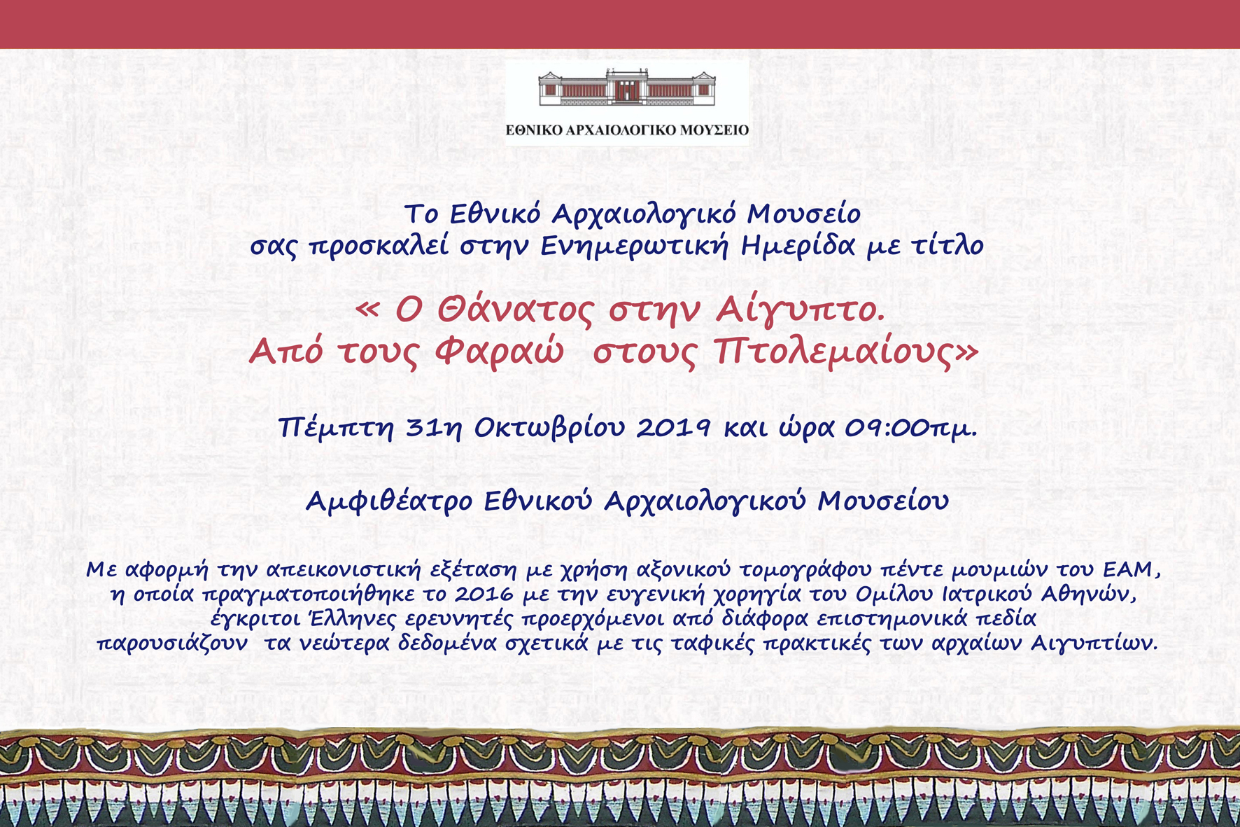 Με αφορμή την παρουσίαση των επιστημονικών πορισμάτων από την εξέταση πέντε μουμιών της Αιγυπτιακής Συλλογής του ΕΑΜ με τη χρήση αξονικού τομογράφου, το Εθνικό Αρχαιολογικό Μουσείο διοργανώνει ενημερωτική ημερίδα με τίτλο «Ο Θάνατος στην Αίγυπτο. Από τους Φαραώ στους Πτολεμαίους». H εξέταση των μουμιών με τη βοήθεια της προηγμένης απεικονιστικής τεχνολογίας πραγματοποιήθηκε με τη συνεργασία του Ελληνικού Ινστιτούτου Αιγυπτιολογίας και χάρη στην ευγενική χορηγία του Ομίλου Ιατρικού Αθηνών και την αρωγή της μεταφορικής εταιρείας «Ορφέας Βεϊνόγλου».