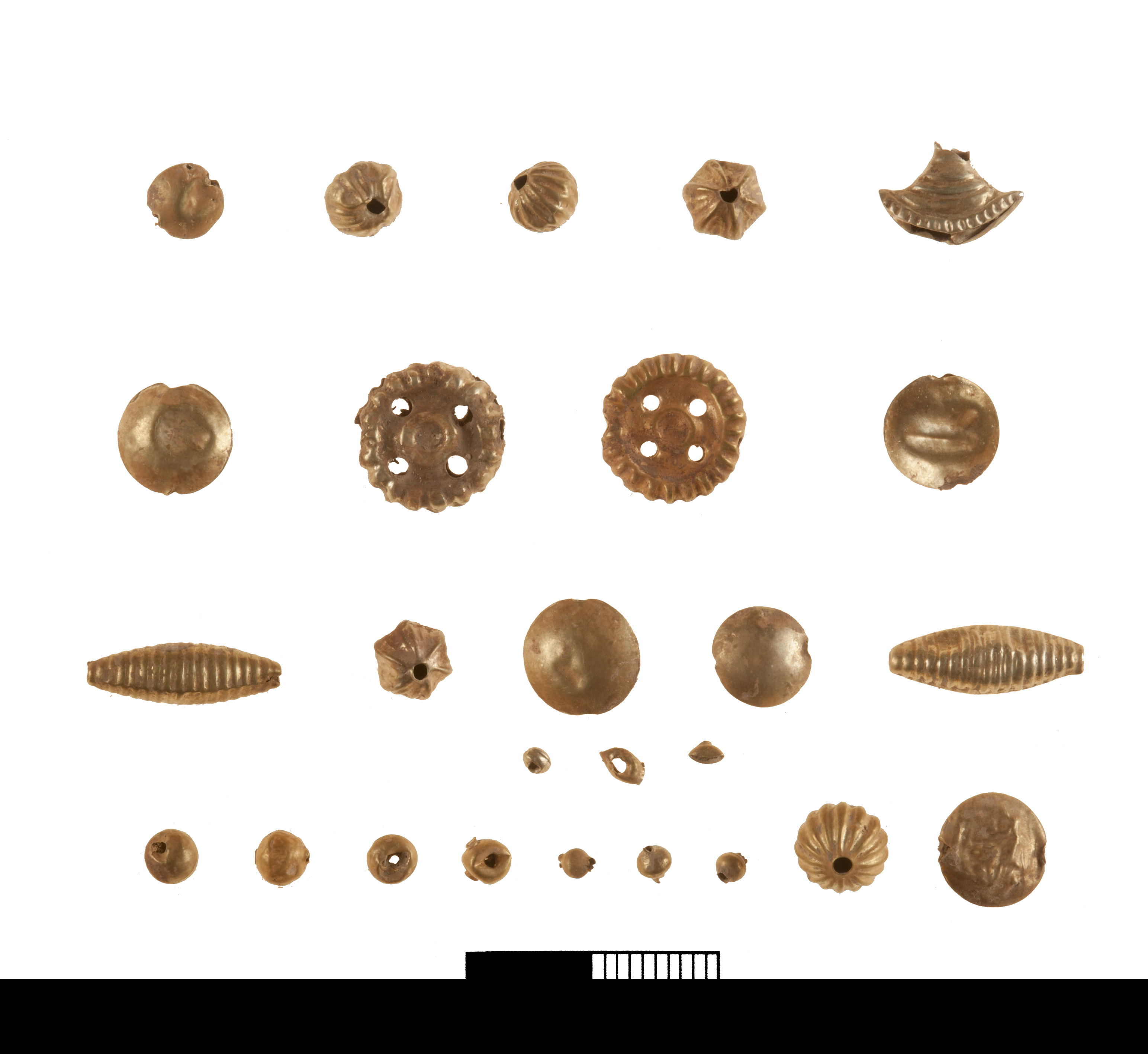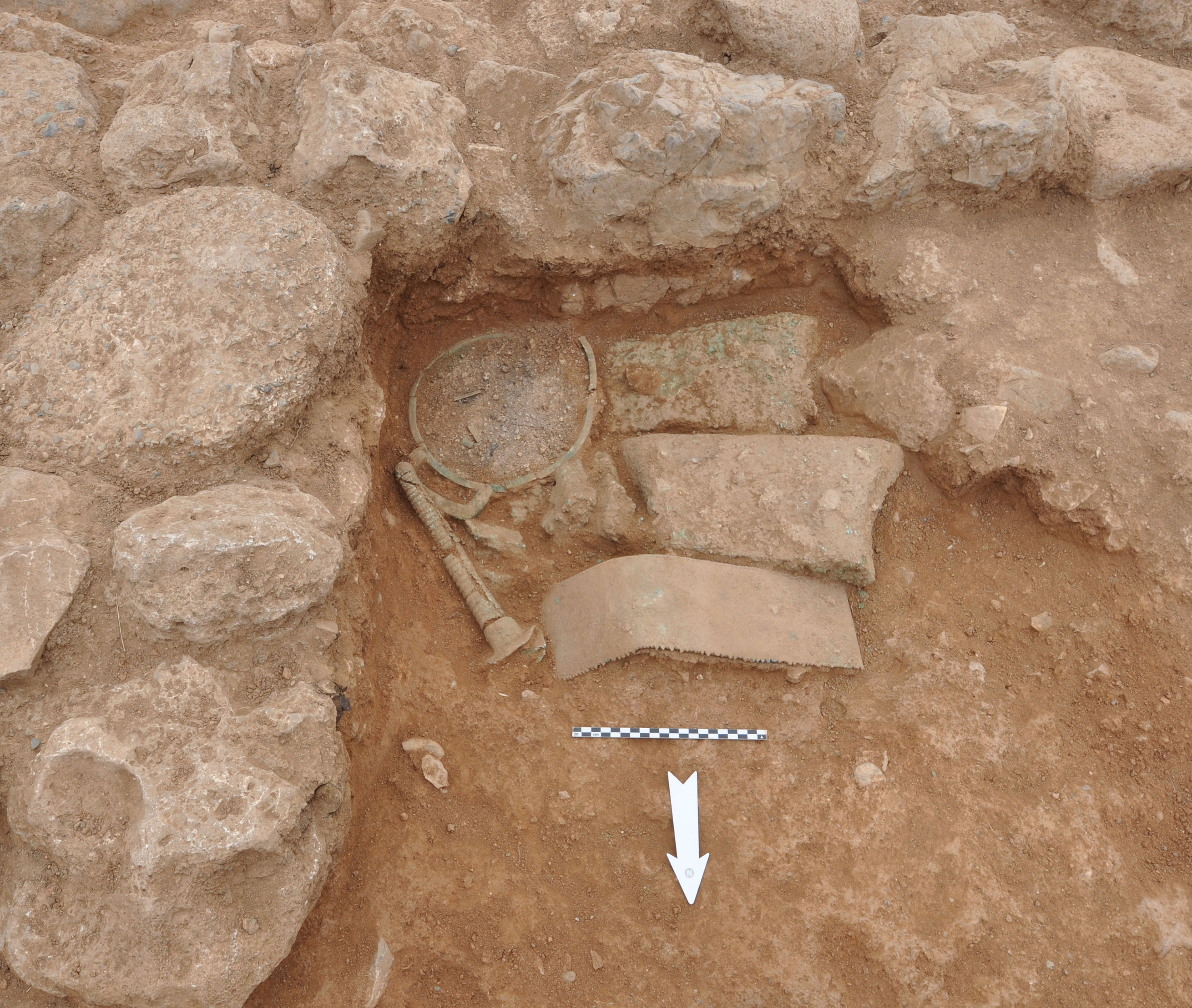 Παρά την απλή αρχιτεκτονική τους, δύο δωμάτια περιείχαν 'θησαυρούς' από μέταλλα, γυαλί και ημιπολύτιμους λίθους. Ο πρώτος θησαυρός βρέθηκε το 2018 σε δωμάτιο που πιθανότατα χρησίμευε ως αποθηκευτικός χώρος. Η απόθεση περιείχε δύο τμήματα από χάλκινα τάλαντα, μια μάζα από σκωρίες και κοσμήματα: ένα χρυσό δαχτυλίδι, ένα χρυσό βραχιόλι, 26 χρυσές χάντρες (δισκοειδείς, σφαιρικές και σε σχήμα πάπυρου), μια αργυρή χάντρα, 5 χάλκινες, σφενδόνη χάλκινου δαχτυλιδιού. Μαζί με αυτά ήταν μεγάλος αριθμός από γυάλινες χάντρες διαφόρων σχημάτων, (39 σφαιρικές και 25 σε σχήμα πάπυρου), 4 από το λεγόμενο αιγυπτιακό μπλε, 20 από κορνεόλιο λίθο, 1 από αμέθυστο, 10 από λάπις, μια σφραγίδα από αχάτη με παράσταση πλοίου που η πρύμνη του έχει τη μορφή κεφαλής ζώου και ένα λίθινο περίαπτο με μορφή πιθήκου.