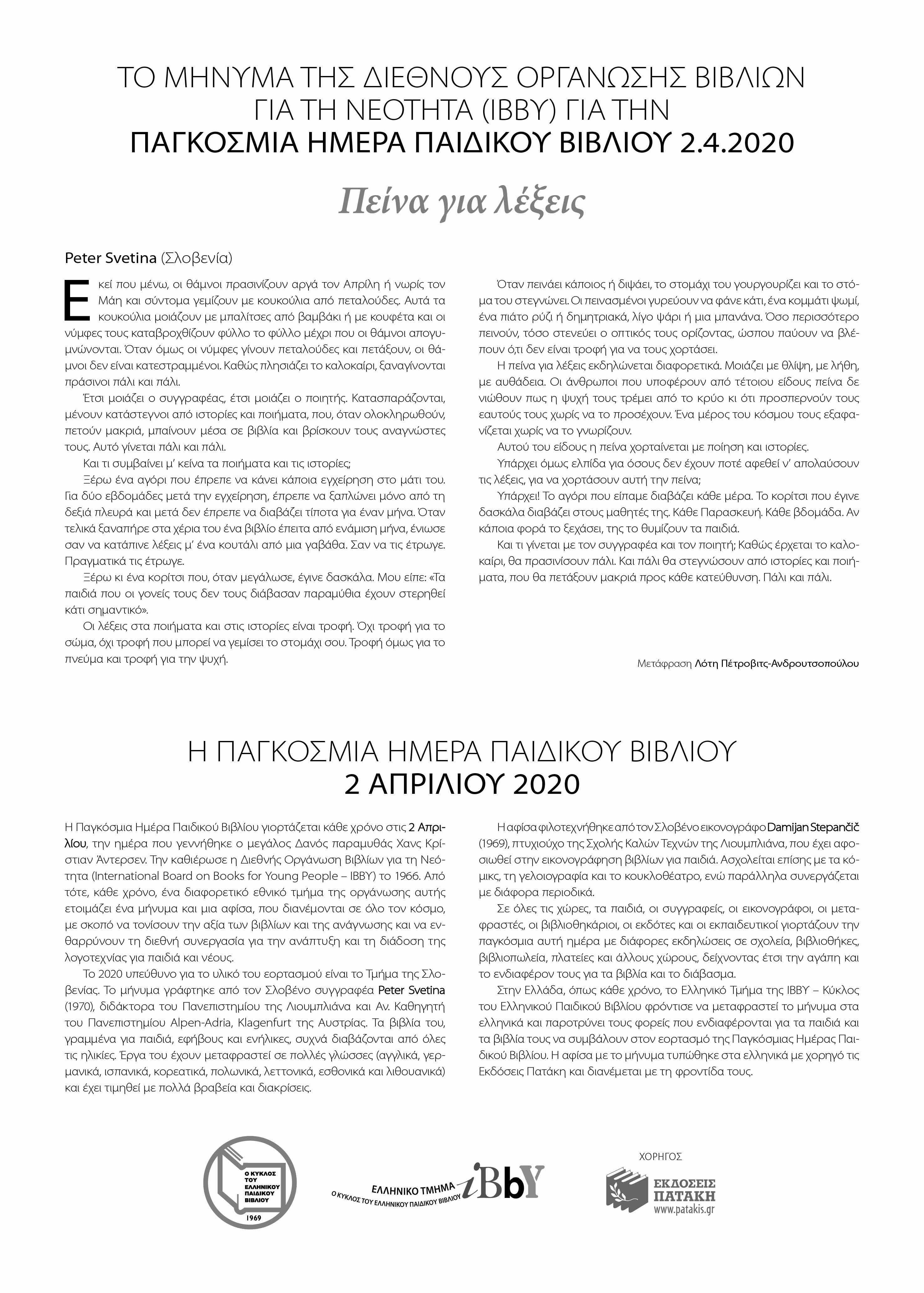 Έλληνες συγγραφείς παιδικών βιβλίων ταλαντούχοι και ευφάνταστοι, εικονογράφοι, ικανοί και δημιουργικοί, που διακρίνονται διεθνώς, κάνουν πλούσια τη μέρα των παιδιών μας, ξεκολλώντας τα από την ηλεκτρονική εικόνα που δεν αφήνει περιθώρια στη δημιουργική φαντασία τους. Ο ρόλος της διαμεσολάβησης του συγγραφέα ανάμεσα στο παιδί και στο φανταστικό είναι μεγάλη ευθύνη.