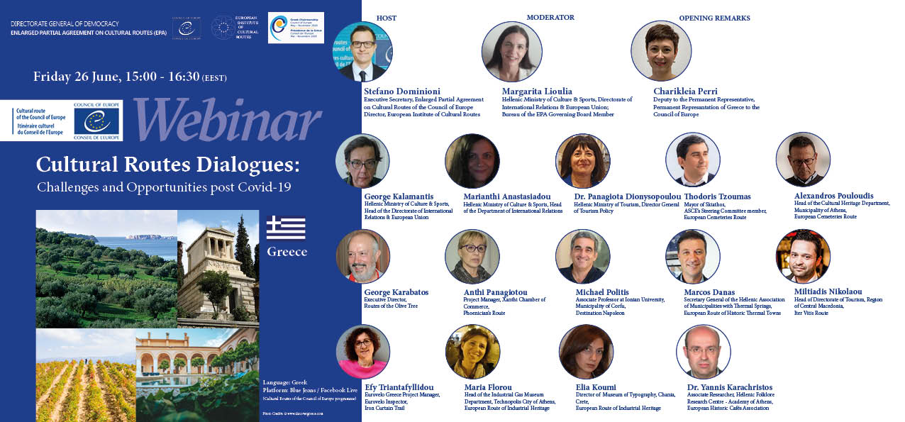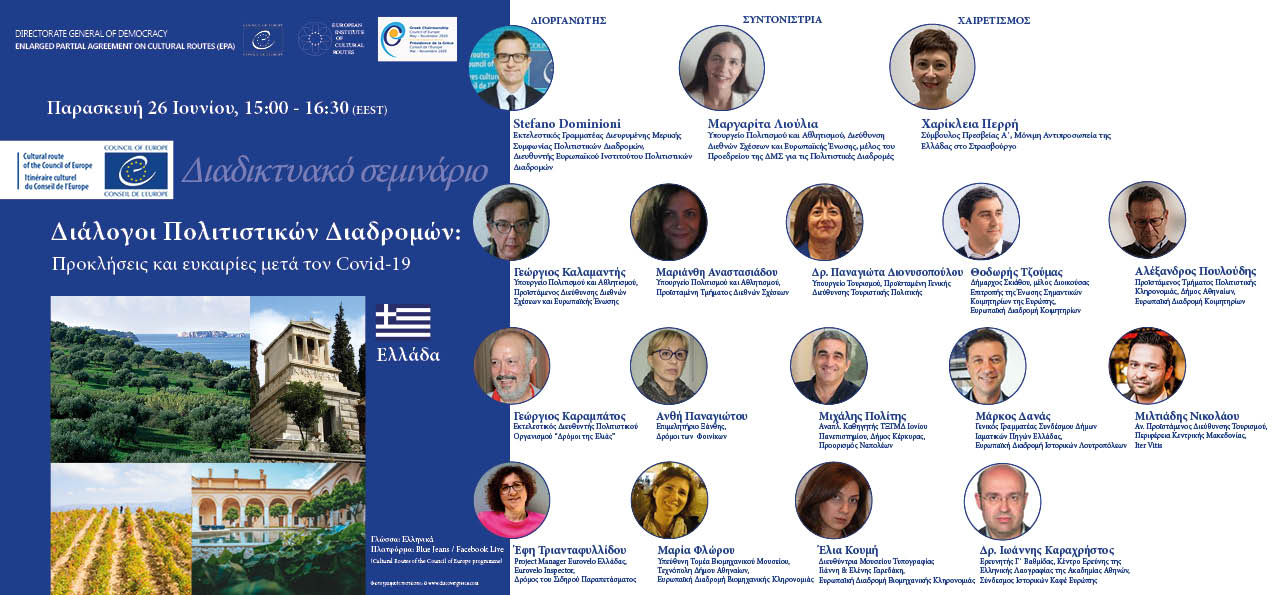 Η Διεύθυνση Διεθνών Σχέσεων & ΕΕ του ΥΠΠΟΑ, σε συνεργασία με τη Γραμματεία της Διευρυμένης Μερικής Συμφωνίας Πολιτιστικών Διαδρομών του Συμβουλίου της Ευρώπης και το Ευρωπαϊκό Ινστιτούτο Πολιτιστικών Διαδρομών, διοργανώνουν την Παρασκευή 26 Ιουνίου στις 3:00 μ.μ. ζωντανή διαδικτυακή συζήτηση (webinar) με θέμα «Διάλογοι Πολιτιστικών Διαδρομών: προκλήσεις και ευκαιρίες μετά τον Covid-19».