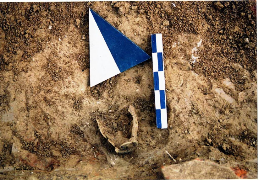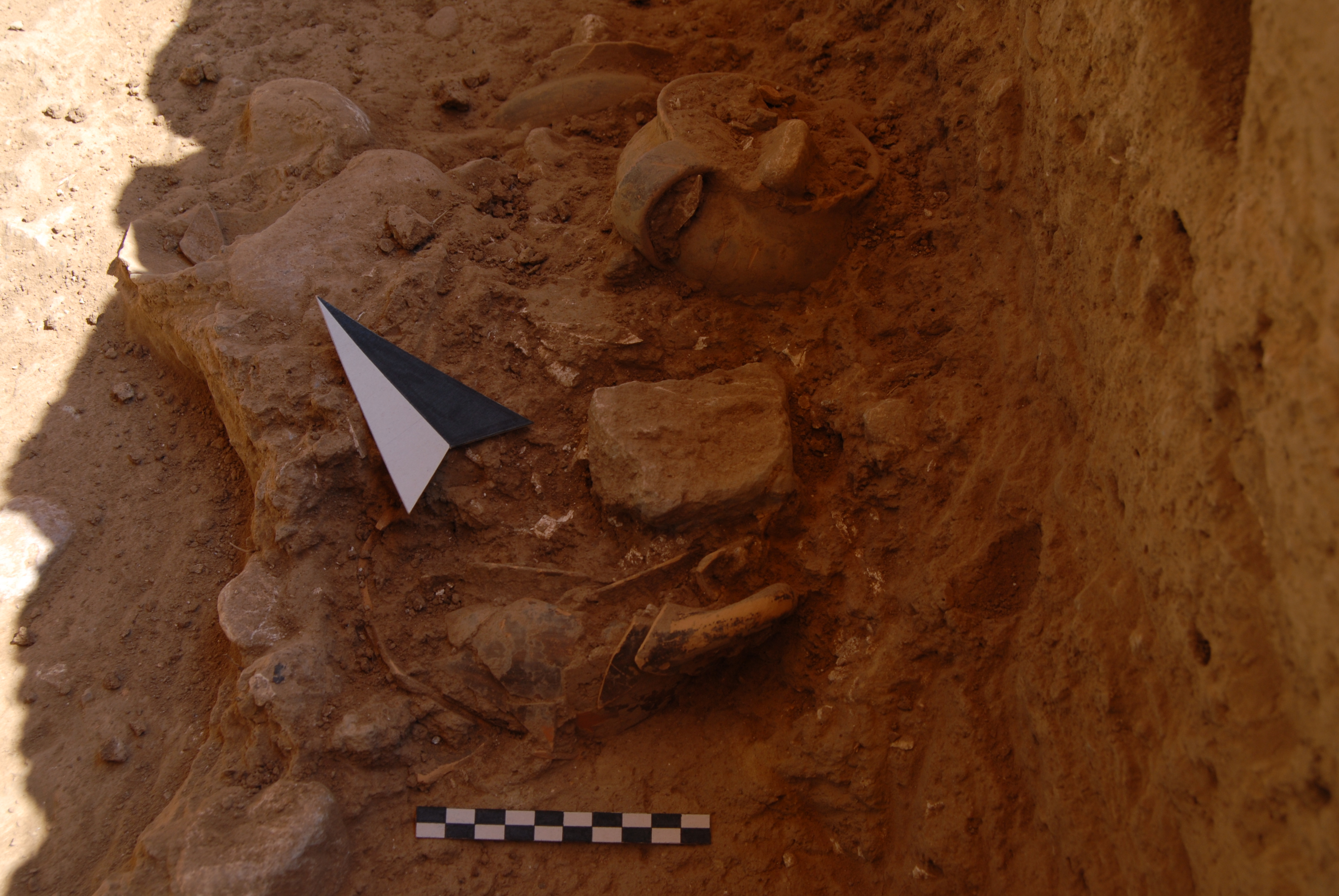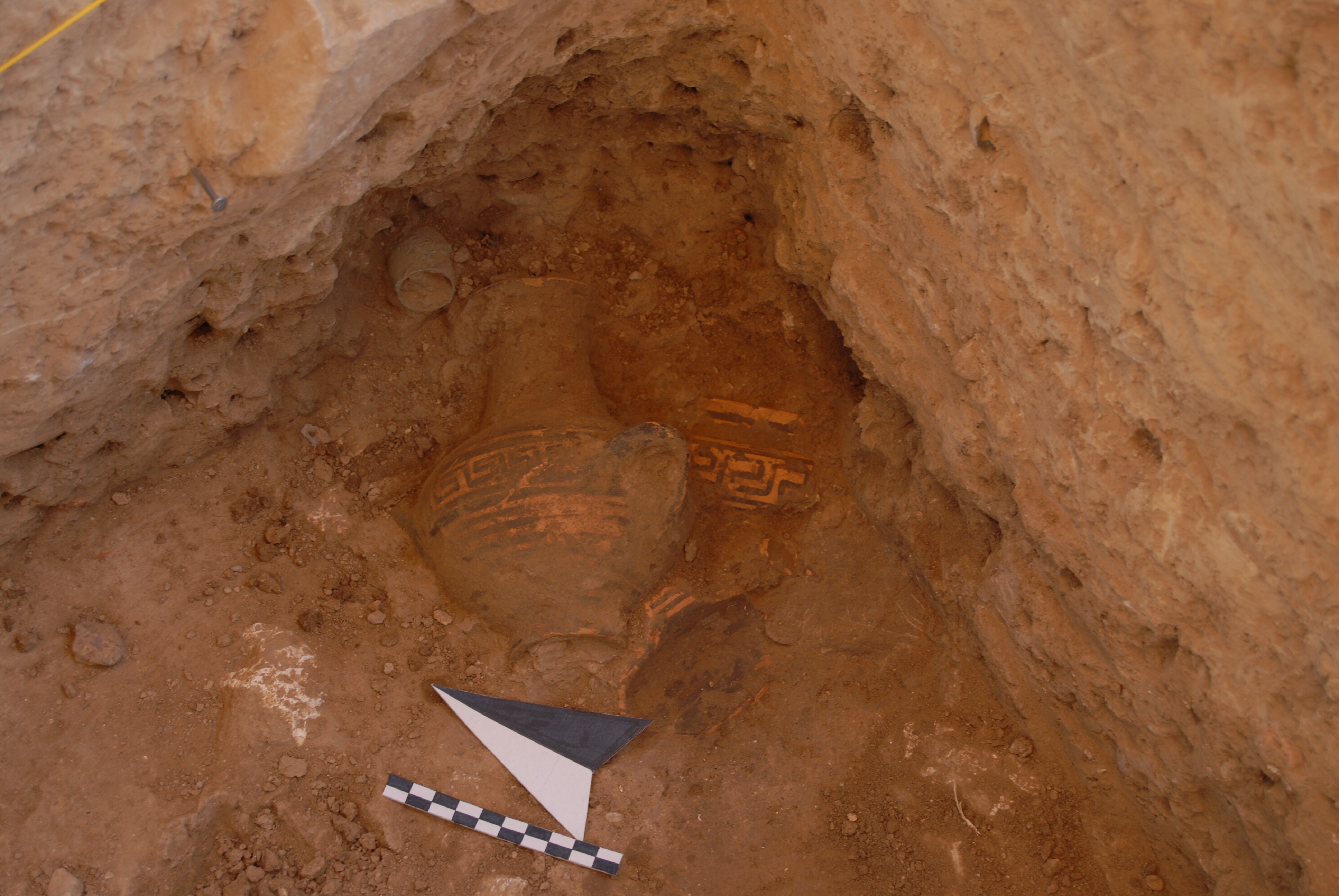 φωτό 3-4. Αγγεία πόσεως (σκύfοι, κάνθαρος) και εκροής (αμφορίσκος) στο στρώμα με τα ίχνη καύσης και τα οστά ζώων, πιθανότατα υπολείμματα λατρευτικών δείπνων. 750-740 π.Χ.