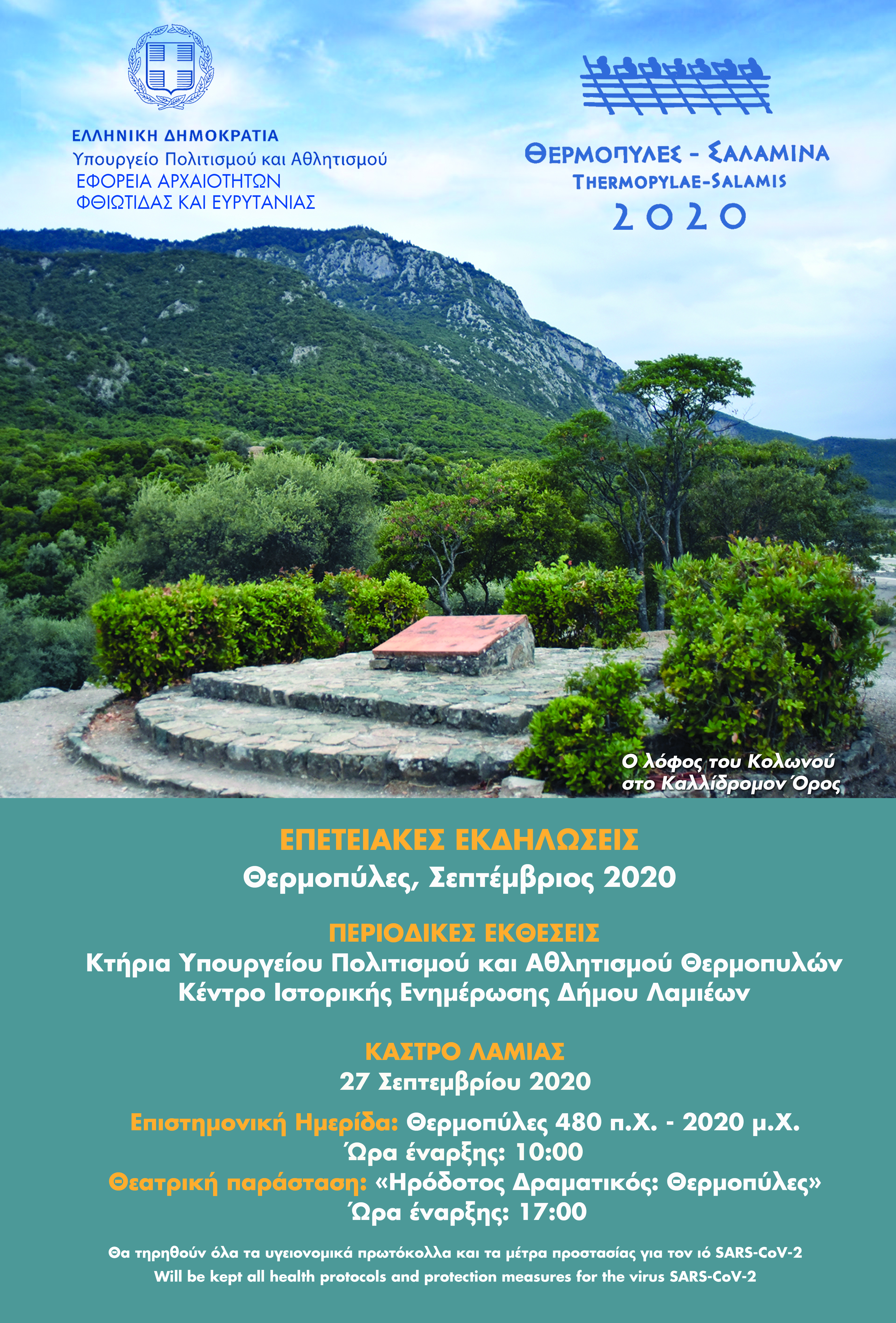Η Εφορεία Αρχαιοτήτων Φθιώτιδας και Ευρυτανίας, με αφορμή τον εορτασμό του επετειακού έτους Θερμοπύλες – Σαλαμίνα 2020, για τη συμπλήρωση 2.500 ετών από τη διεξαγωγή των αντίστοιχων μαχών, παρουσιάζει τις ακόλουθες επετειακές εκδηλώσεις, οι οποίες θα πραγματοποιηθούν στο Κάστρο της Λαμίας και στον αρχαιολογικό χώρο των Θερμοπυλών (Κέντρο Ιστορικής Ενημέρωσης Δήμου Λαμιέων και εγκαταστάσεις του ΥΠΠΟΑ πλησίον του Κολωνού). Αναλυτικότερα, οι εκδηλώσεις αφορούν: