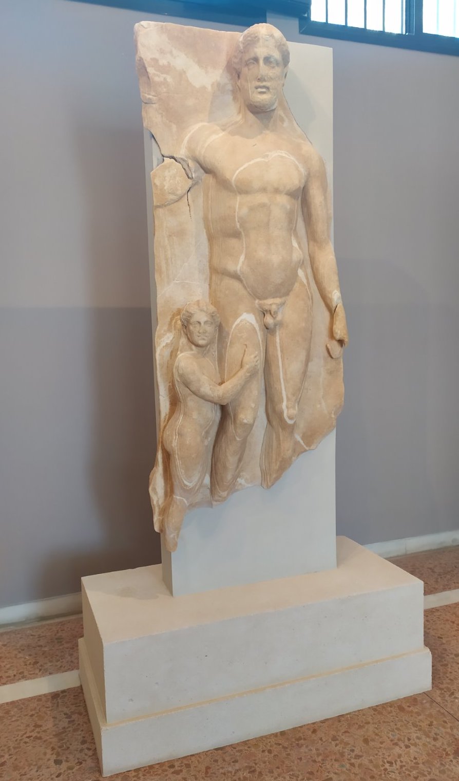 Η εύρεση της στήλης είναι αποτέλεσμα της συστηματικής ανασκαφής στο Ξώμπουργο, που διεξάγεται από το Εθνικό και Καποδιστριακό Πανεπιστήμιο Αθηνών, υπό τη διεύθυνση της Ομότιμης Καθηγήτριας Κλασικής Αρχαιολογίας κ. Νότας Κούρου και ειδικότερα στο αρχαίο νεκροταφείο των κλασικών χρόνων στη θέση Βαρδαλάκος στη ΝΑ πλευρά του λόφου του Ξώμπουργου, βρέθηκε μεγάλη μαρμάρινη επιτύμβια στήλη. Η στήλη (αρ. κατ. Α 587) χρονολογείται τον 4ο αι. π.Χ. (370-360 π.Χ.) και αποτελεί εξαίρετο έργο γλυπτικής, δημιούργημα πιθανότατα Τήνιου γλύπτη, όπως υποδεικνύει το ντόπιο μάρμαρο από το οποίο είναι κατασκευασμένη. Η στήλη ύψους 1,70 μ. και πλάτους 0,765 μ. σώζεται αποσπασματικά. Εικονίζεται γυμνός γενειοφόρος άνδρας με στλεγγίδα στο αριστερό χέρι. Πρόκειται για αθλητή (παλαιστρίτης) που συνοδεύεται από μικρή παιδική μορφή με πτηνό. Το θέμα 'αθλητής με παίδα' είναι σύνηθες στη γλυπτική των Κλασικών Χρόνων και η παρουσία του παίδα θεωρείται ότι ενέχει έναν ιδιαίτερο συμβολισμό που έχει δεχθεί πολλές ερμηνείες (υπηρέτης του αθλητή, έφηβος ερωτικός σύντροφος κ.ά.). Το μικρό μέγεθος και η ηλικία του παίδα, φαίνεται να αποκλείουν τον συνήθως ερωτικό χαρακτήρα που αποδίδεται σε παρόμοιες σκηνές, ενώ η παρουσία του πτηνού παραπέμπει στο γνωστό θέμα της ψυχής που απέρχεται.