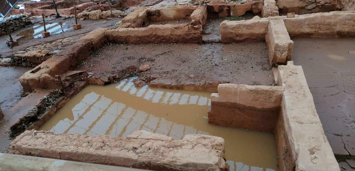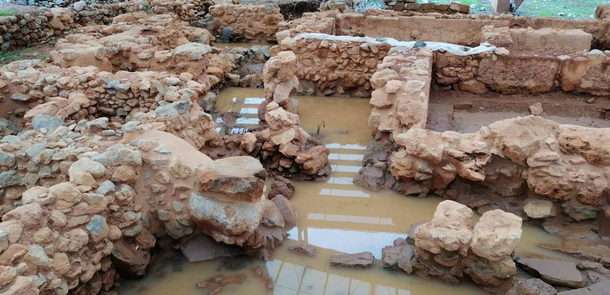 Μεγάλος όγκος υδάτων εισήλθε και στο εσωτερικό των ανεσκαμμένων χώρων από τα στέγαστρα προστασίας, καθώς τα κανάλια απορροής των ομβρίων υπερχείλισαν από την ένταση της βροχής. Διαπιστώθηκε ότι η κλίση των καναλιών απορροής είναι εσφαλμένη με αποτέλεσμα να μην λειτουργούν ικανοποιητικά σε βροχή μεγάλης έντασης. Αλλά και η στάθμη του εδάφους περιμετρικά των ανεσκαμμένων χώρων είναι υψηλότερη και δεν έχουν προβλεφθεί αποστραγγιστικές τάφροι. Ετσι, τα όμβρια που απορρέουν από τα στέγαστρα και τα πέριξ αυτών, κατέληξαν στο εσωτερικό των χώρων, τόσο του Quartier Mu -συνοικία εργαστηρίων- όσο και στον παρακείμενο χώρο της Υπόστυλης Κρύπτης, παρά την ύπαρξη φρεατίου απορροής. Κατά τη σημερινή αυτοψία, διαπιστώθηκε ότι επικάθησε στα δάπεδα παχύ στρώμα λάσπης το οποίο, θα απομακρυνθεί από τους συντηρητές, όταν στεγνώσει. Τότε θα είναι εφικτή η συνολικότερη αποτίμηση της κατάστασης των επιχρισμάτων. Πάντως μέχρι στιγμής, δεν υπάρχουν καταρρεύσεις τοίχων ή άλλες σοβαρές καταστροφές. Οι μηχανικοί και συντηρητές της Εφορείας θα συντάξουν λεπτομερείς τεχνικές εκθέσεις για την αντιμετώπιση των προβλημάτων.