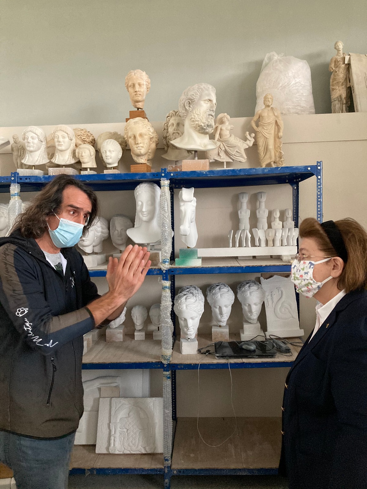 Τη Λίνα Μενδώνη υποδέχθηκαν και ξενάγησαν στους χώρους των εργαστηρίων και στην εντυπωσιακή μοντελοθήκη των εκμαγείων του ΟΔΑΠ ο Πρόεδρος του Δ.Σ. του Οργανισμού Παναγιώτης Νταής, ο Γενικός Διευθυντής Ηλίας Πατσαρούχας, η Αλεξάνδρα Χαριτάτου, εκτελεστικό μέλος του Δ.Σ., ο υπεύθυνος εργαστηρίων γλύπτης Στέλιος Γαβαλάς, η αρχαιολόγος Χαρά Αυλωνίτου, αν. προϊσταμένη της Διεύθυνσης Πολιτιστικών Παραγωγών, Πωλήσεων και Προβολής του ΟΔΑΠ, ο συντηρητής αρχαιοτήτων και έργων τέχνης Βασίλης Λιόλιος.