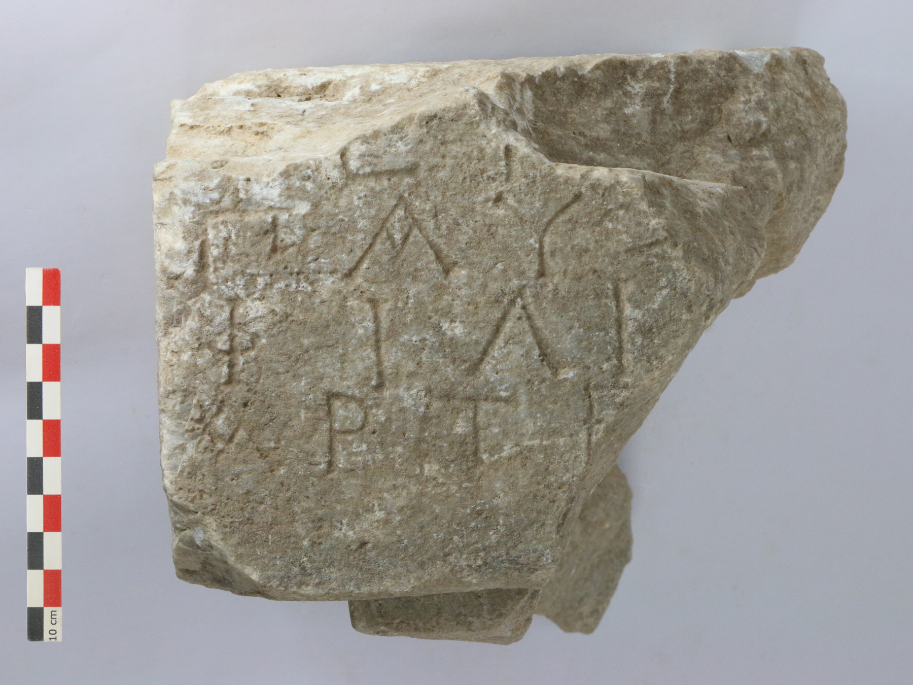 9) Θραύσμα μαρμάρινης βάσης αγάλματος αφιερωμένου στην Αρτέμιδα.