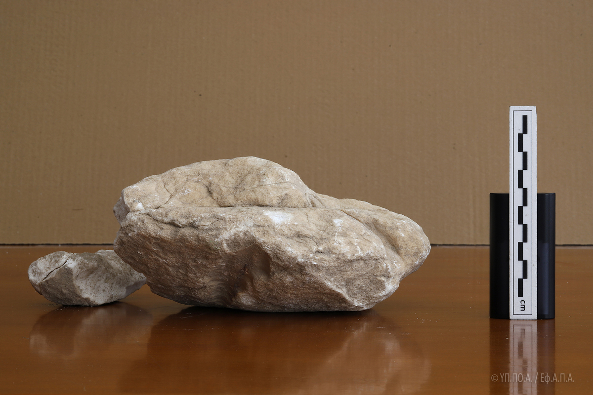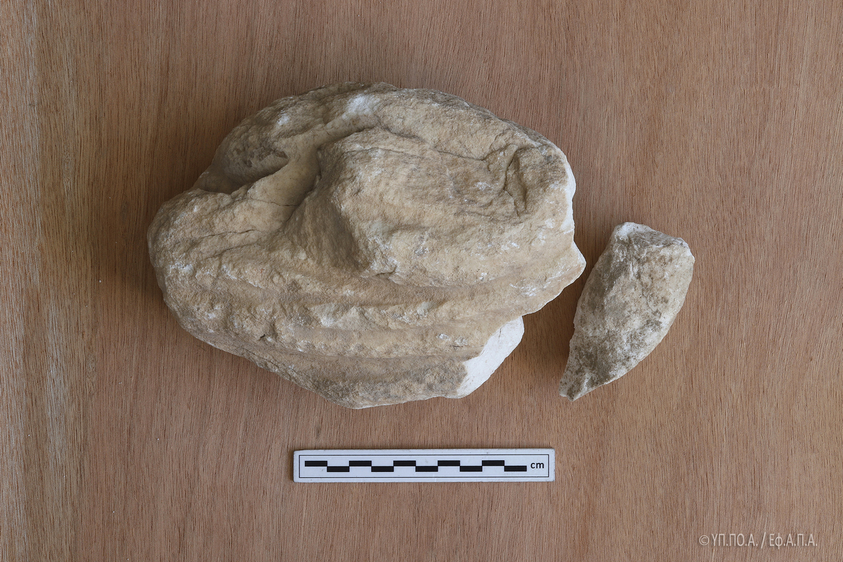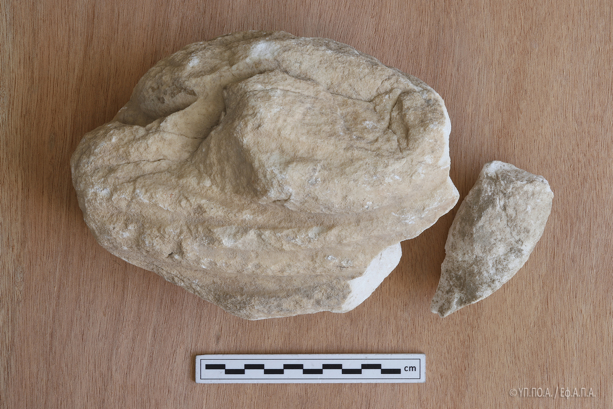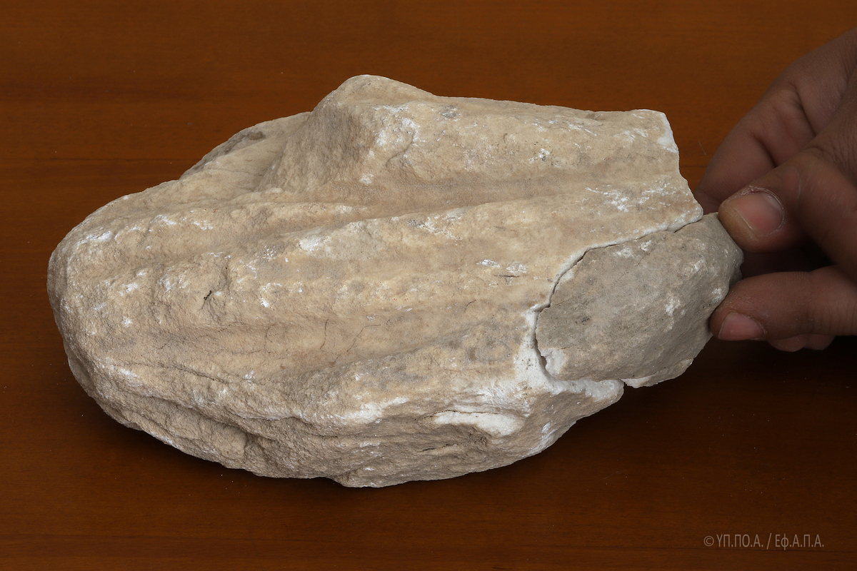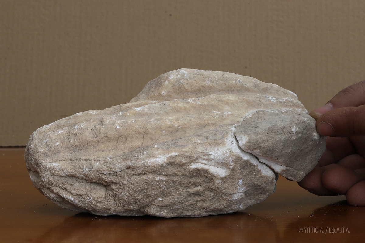 Το εν λόγω θραύσμα, εξαιρετικά διαβρωμένο και με ρηγματώσεις σε όλη του την επιφάνεια, το οποίο, κατά το δημοσίευμα της «Αυγής» κατεστράφη από χρήση κομπρεσέρ, επλήγη κατά τις εργασίες που έγιναν χειρωνακτικά, αποκλειστικά και μόνο με τη χρήση αξίνας και φτυαριού.