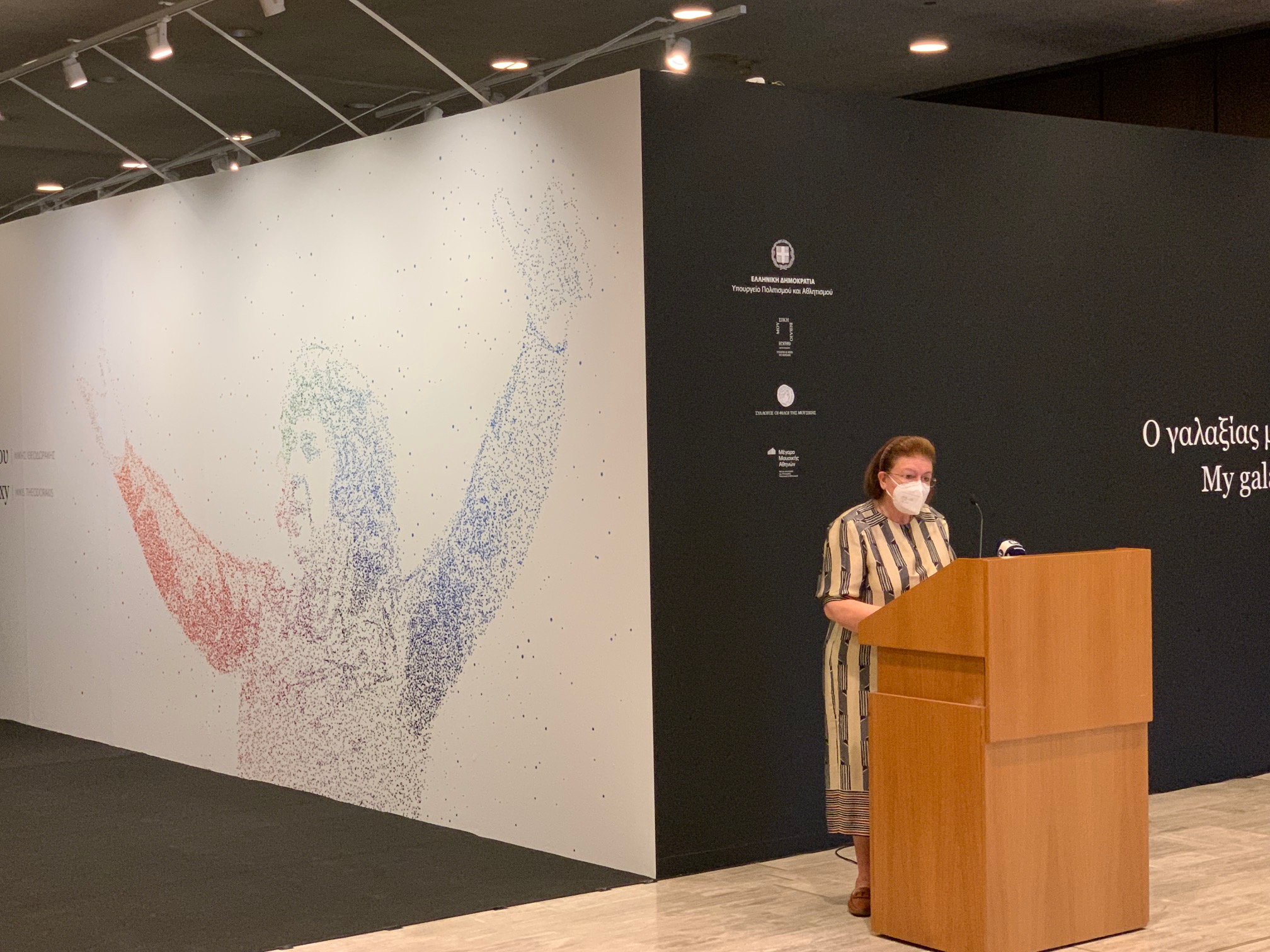 Θα έλεγα ότι πάντοτε και φυσικά και απόψε ο Μίκης, αν και απών, γίνεται μια αόρατη μαγική κλωστή που συνδέει όλους τους Έλληνες, όπου κι βρίσκονται, με την Ελλάδα. Για τον Μίκη Θεοδωράκη η επετειακή έκθεση που εγκαινιάζουμε απόψε αποτελεί ένα ακόμα αστέρι στη σχεδόν ενός αιώνα μουσική διαδρομή του, μια διαδρομή γεμάτη με τόσα πολλά «αστέρια», ώστε να συνθέτουν έναν ολόκληρο «γαλαξία» στη μουσική του σύμπαντος: Τον Γαλαξία του Μίκη.