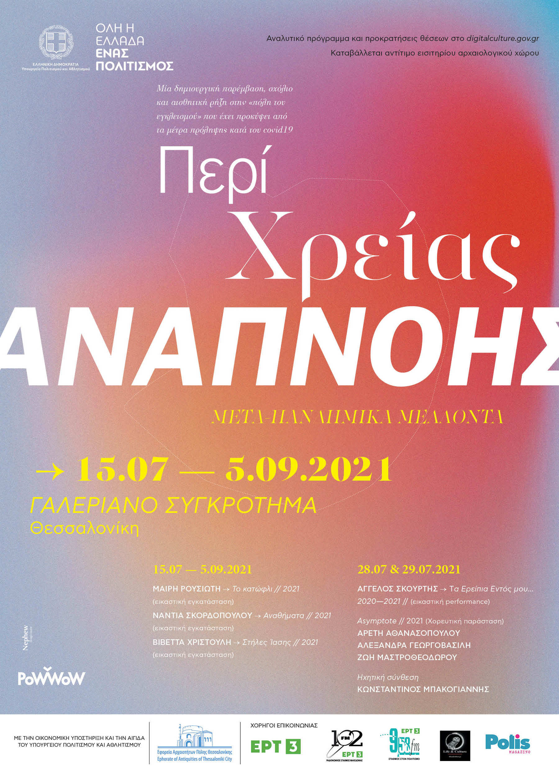 H καλλιτεχνική δράση «Περί Χρείας Αναπνοής, Μετά Πανδημικά Μέλλοντα» παρουσιάζει δύο διαφορετικές παραστάσεις στις 28 και 29 Ιουλίου. Η πρώτη τιτλοφορείται «Τα Ερείπια εντός μου…» και πρόκειται για την εικαστική performance του Άγγελου Σκούρτη, ενώ η δεύτερη ονομάζεται «Asymptote», είναι χορευτική παράσταση και παρουσιάζεται σε πρωτότυπη μουσική του Κωνσταντίνου Μπακογιάννη. Ταυτοχρόνως, οι δύο αυτές παραστάσεις πλαισιώνονται από τρεις εικαστικές εγκαταστάσεις: «Το Κατώφλι» της Μαίρης Ρουσιώτη, τα «Αναθήματα» της Νάντιας Σκορδοπούλου και τις «Στήλες Ίασης» της Βιβέτας Χριστούλη, που θα εκτίθενται στο Γαλεριανό Συγκρότημα Θεσσαλονίκης από τις 15 Ιουλίου έως τις 5 Σεπτεμβρίου.