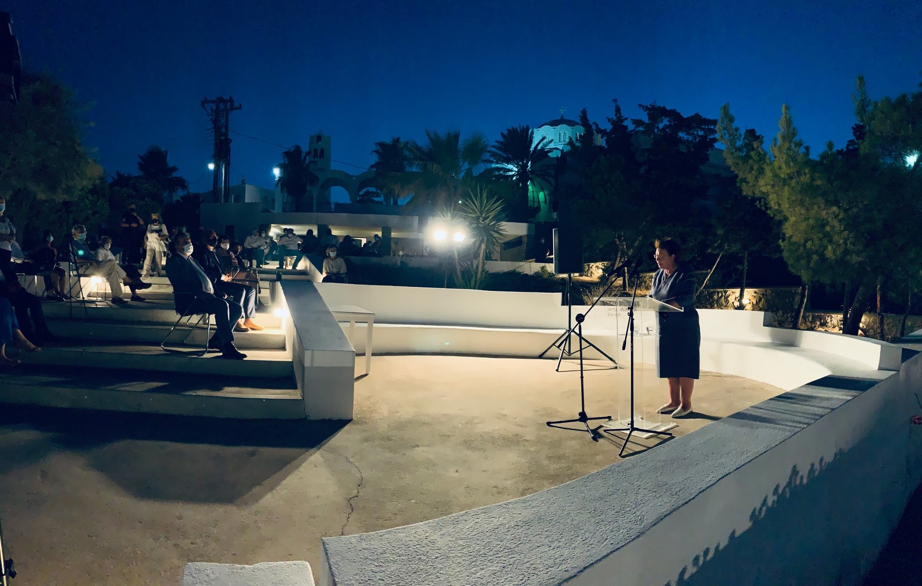 Η Λίνα Μενδώνη στον χαιρετισμό της ανέφερε: «Μέχρι σήμερα ελαχιστότατα δείγματα από αυτόν τον τεράστιο πλούτο ήταν φυσικά προσβάσιμα και μπορούσε να τα δει το ευρύ κοινό, καθώς στη συντριπτική τους πλειοψηφία οι τοιχογραφίες αυτές δεν έχουν ποτέ εκτεθεί. Οι σημαντικότερες των τοιχογραφιών εξετίθεντο μέχρι το 1999 στο Εθνικό Αρχαιολογικό Μουσείο στην Αθήνα. Ο σεισμός της Αθήνας δημιούργησε σοβαρά προβλήματα στο τμήμα του κτηρίου του Μουσείου με τις τοιχογραφίες. Ο σεισμός ήταν η αιτία που τότε το Υπουργείο Πολιτισμού αποφάσισε ένα μέρος των τοιχογραφιών να συνεχίσει να εκτίθεται στο αποκατεστημένο κτήριο του Εθνικού Αρχαιολογικού Μουσείου, καθώς αποτελούν μοναδικές ψηφίδες των πολιτισμών που άνθησαν στον ελληνικό χώρο, άρα υποχρεωτικά έπρεπε να κοσμούν την έκθεση του Εθνικού μας Μουσείου, ενώ το μεγαλύτερο μέρος του να επιστρέψει και να εκτεθεί στην γενέθλια γη της Σαντορίνης, όπου ανήκουν, προκειμένου να εκπαιδεύουν και να ψυχαγωγούν τους κατοίκους και τις χιλιάδες των επισκεπτών του νησιού... Μεσολάβησαν 22 χρόνια μέχρι να γίνει πράξη εκείνη η απόφαση του 1999. Ολόκληρα 22 χρόνια. Σήμερα είναι μια πολύ μεγάλη μέρα, όχι μόνον για την Σαντορίνη και για την Ελλάδα. Για όλο τον κόσμο. Το Υπουργείο Πολιτισμού και Αθλητισμού προσφέρει σήμερα στην Σαντορίνη αυτό που δικαιωματικά της ανήκει. Και δημιουργεί ένα γεγονός διεθνούς εμβέλειας. Γιατί είναι η πρώτη φορά που εκτίθενται στην Θήρα, στην Σαντορίνη, οι δικές της τοιχογραφίες. Γιατί είναι η πρώτη φορά που εκτίθενται κάποιες τοιχογραφίες από τις αποθήκες του Ακρωτηρίου, που μπορούμε να τις θαυμάσουμε όλοι. Γιατί είναι η πρώτη φορά που οι τοιχογραφίες βρίσκουν την αρχική θέση που είχαν σε ένα δημόσιο ή σε ένα ιδιωτικό κτήριο και μπορούμε όλοι, ακόμη και οι ειδικοί, να αντιληφθούμε, να κατανοήσουμε το εικονογραφικό πρόγραμμα κάθε δωματίου, κάθε οικοδομήματος, στο σύνολό του και να συνειδητοποιήσουμε το υψηλότατο επίπεδο ζωής στο Ακρωτήρι, αλλά και τη μαγεία και την αισθητική αυτής της ζωγραφικής τέχνης 4.500 χρόνια πριν».