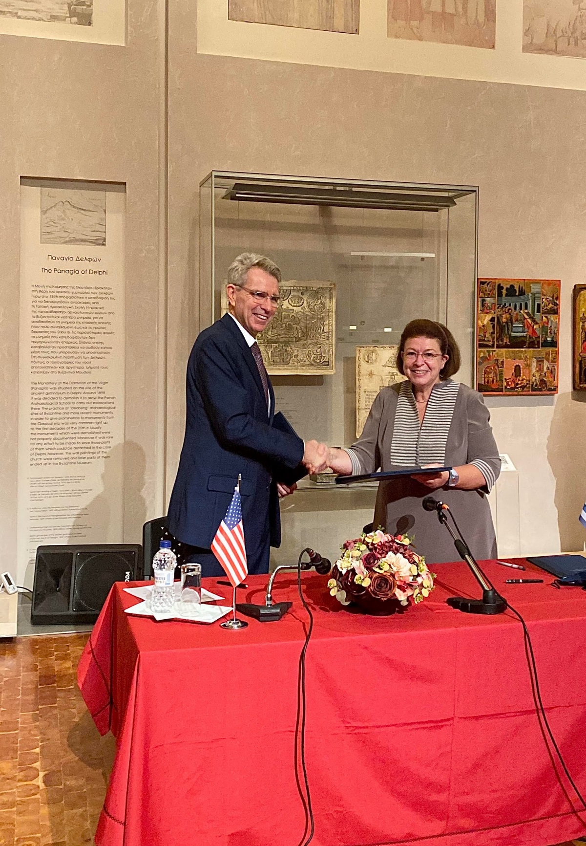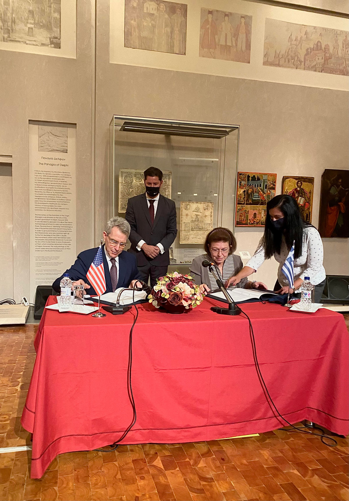 Την ανανέωση του Μνημονίου Κατανόησης ανάμεσα στην Ελλάδα και στις Ηνωμένες Πολιτείες της Αμερικής για την προστασία των ελληνικών πολιτισμικών αγαθών με την περαιτέρω επέκταση των προστατευτικών όρων και για κατηγορίες νεότερων ελληνικών πολιτισμικών αγαθών, υπέγραψαν η Υπουργός Πολιτισμού και Αθλητισμού Λίνα Μενδώνη, εκ μέρους της ελληνικής κυβέρνησης, και ο Πρέσβης των Ηνωμένων Πολιτειών της Αμερικής στην Ελλάδα Geoffrey R. Pyatt.