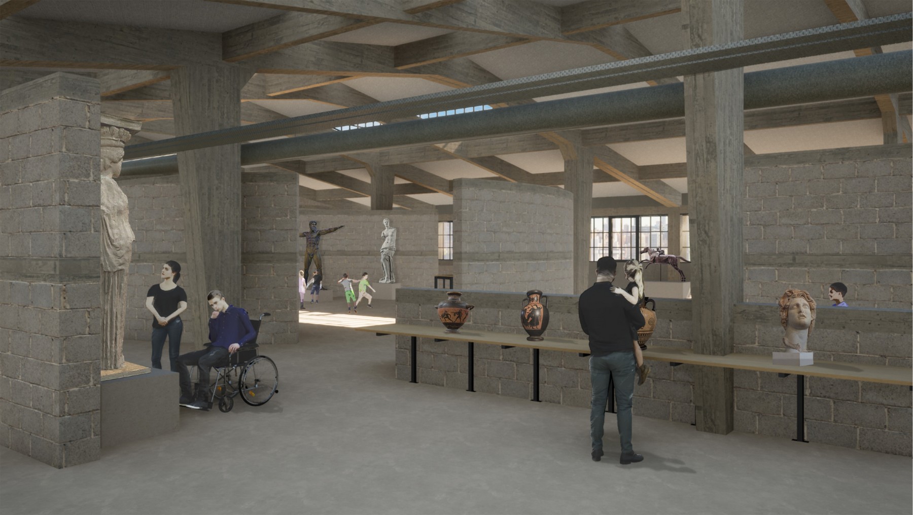 Στόχος της αρχιτεκτονικής μελέτης είναι το κτήριο να διατηρήσει τον αρχικό του χαρακτήρα και τη μορφή του. Στο πλαίσιο αυτό το περίβλημά του συντηρείται και αποκαθίσταται στην αρχική του μορφή σχεδόν στο σύνολό του. Μια πρόκληση που αντιμετωπίζει η μελέτη είναι ο συνδυασμός ετερόκλητων χρήσεων μέσα στο ίδιο κτηριακό κέλυφος και η λειτουργική σύνδεσή τους. Τα εργαστήρια, τα οποία αποτελούν τον πυρήνα του προγράμματος πρέπει να σχετίζονται με τις αποθήκες και τη γλυπτοθήκη-μοντελοθήκη, και συγχρόνως να είναι επισκέψιμα από το κοινό, παράλληλα με τη γλυπτοθήκη. Το πωλητήριο προβλέπεται να είναι προσβάσιμο ανεξάρτητα από τα εκθεσιακά τμήματα και σε άμεση γειτνίαση με το αναψυκτήριο. Ορίζεται κεντρική είσοδος στο κτίριο, ανοίγονται βοηθητικές είσοδοι που εξυπηρετούν τα εργαστήρια και τις αποθήκες και τη δυνατότητα φόρτωσης και εκφόρτωσης αντικειμένων. Ακόμη, σχεδιάζονται νέα κλιμακοστάσια -πέρα του υφιστάμενου- καθώς και έξοδοι διαφυγής από το εσωτερικό του κτηρίου κατευθείαν στον περιβάλλοντα χώρο. Η αντιμετώπιση παθολογιών του κτηρίου τόσο αισθητικών όσο και λειτουργικών, συνίστανται κυρίως στην εγκατάλειψή του για μεγάλο διάστημα.