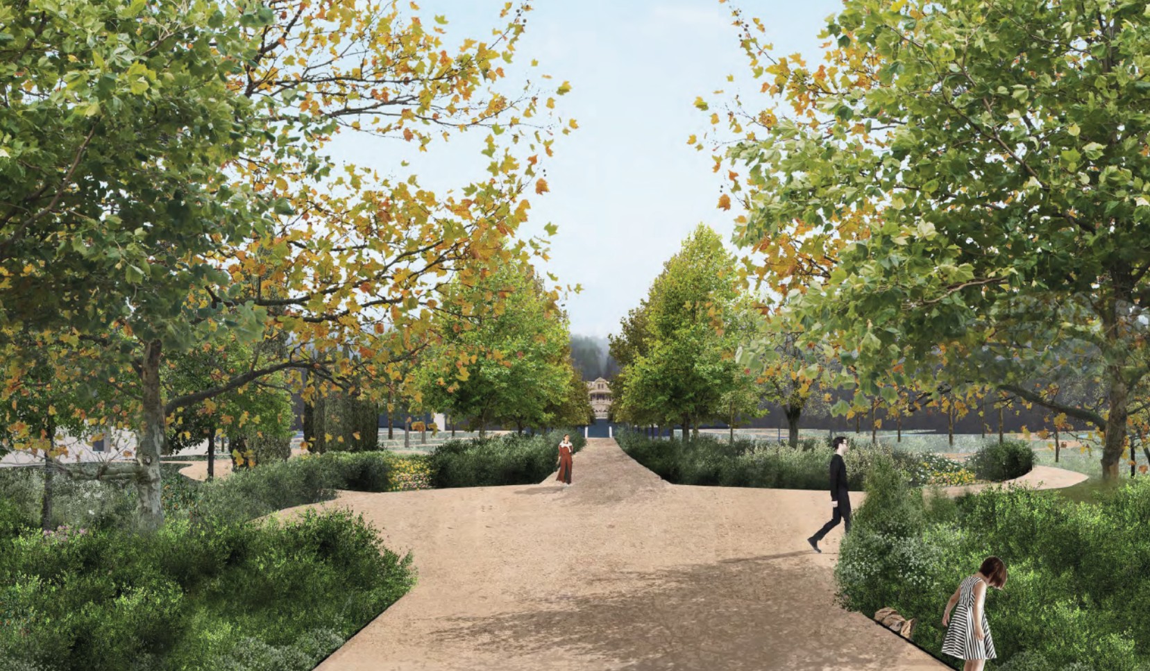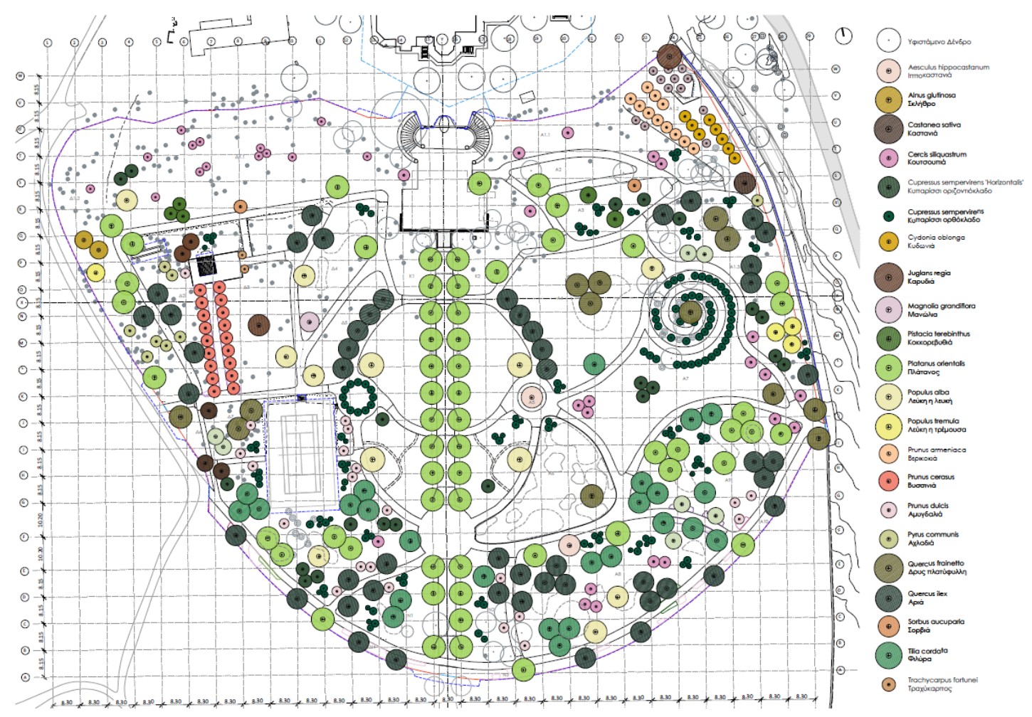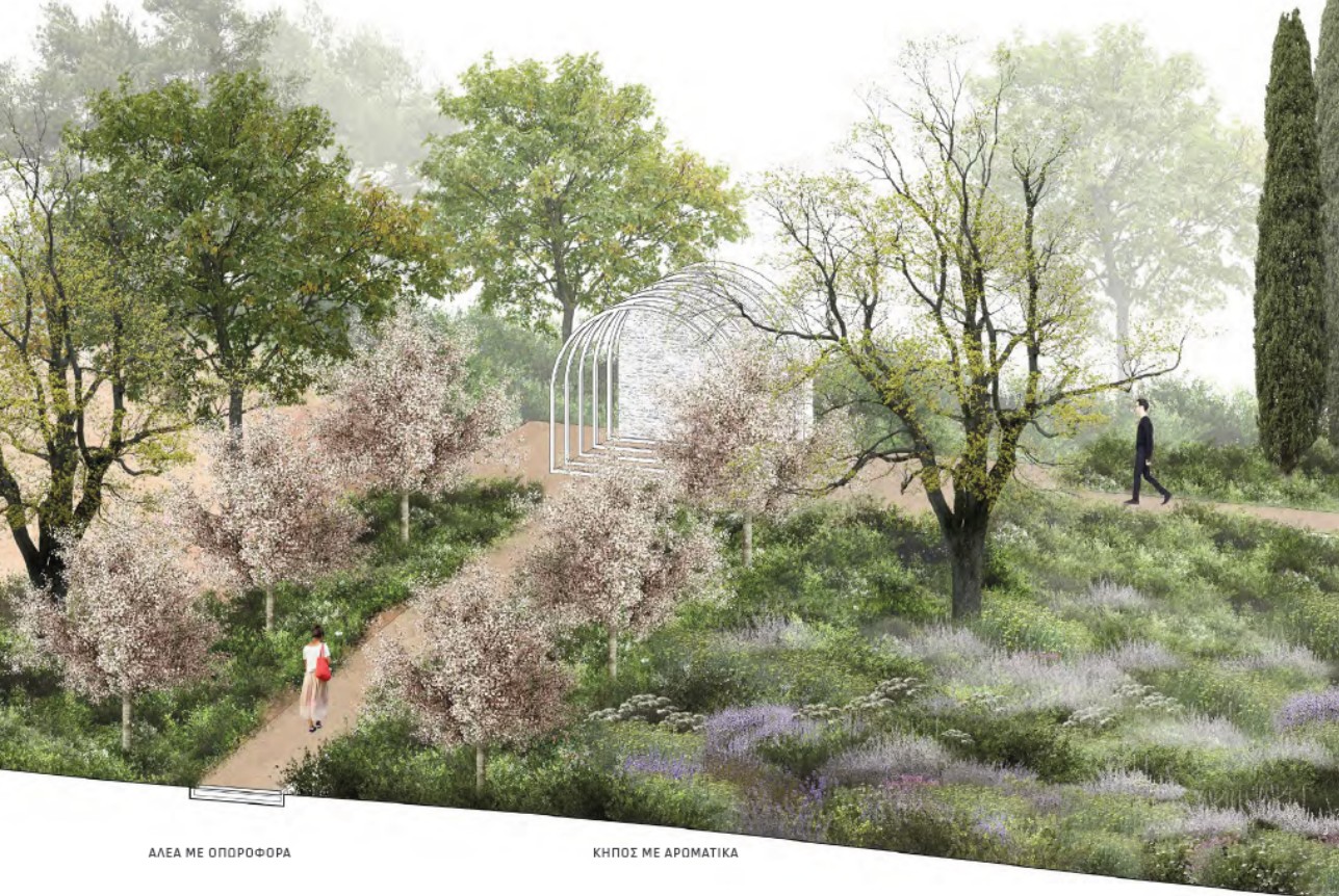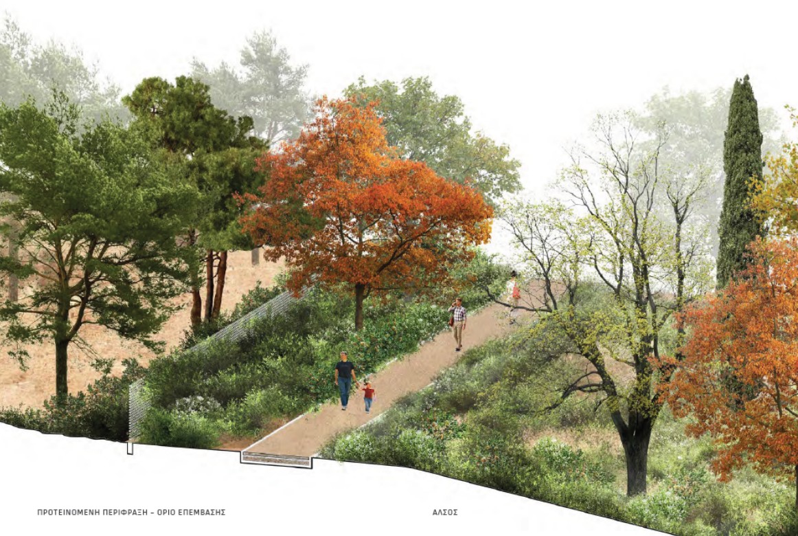 Κύριος στόχος της μελέτης είναι η διαχείριση της μετάβασης μεταξύ δάσους και κήπων, όσο και η αντίληψη του τελευταίου ως περίκλειστου τοπίου, εντείνοντας την αίσθηση της εμβύθισης κατά τη διάρκεια της περιήγησης. Συγχρόνως, η περιμετρική περιοχή μπορεί να δράσει και ως ζώνη επιβράδυνσης πυρκαγιάς, καθώς τα επιλεγμένα δένδρα -πλατύφυλλα και φυλλοβόλα- και ο υποόροφος τους καθυστερούν την επέκταση της φωτιάς. Τα μονοπάτια ακολουθούν τις αρχικές χαράξεις των κήπων, όπως αυτές γίνονται αντιληπτές από τα θραύσματα της οριοθέτησής τους.