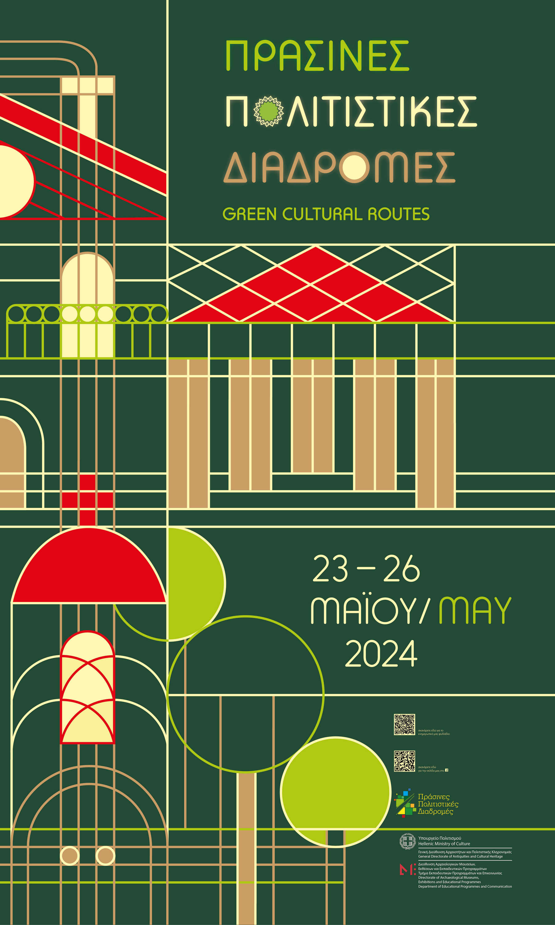 Το Υπουργείο Πολιτισμού διοργανώνει και φέτος από τις 23 έως τις 26 Μαΐου σε όλη τη χώρα, την επικοινωνιακή δράση «Πράσινες Πολιτιστικές Διαδρομές» με πλήθος εκδηλώσεων για το ευρύ κοινό και τη μαθητική κοινότητα.