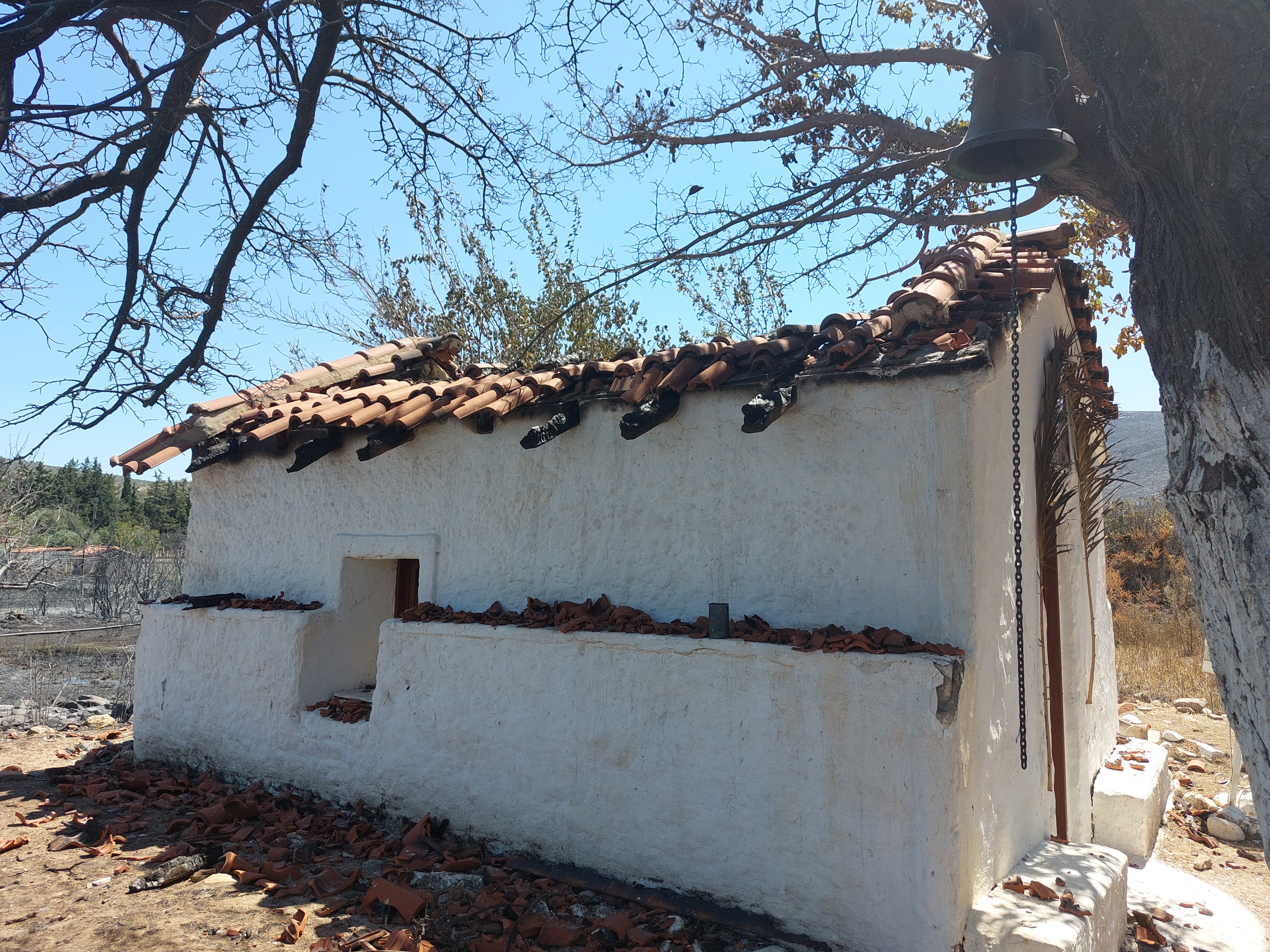 Σημαντικές φθορές έχει υποστεί, επίσης, η νεότερη στέγη και το εσωτερικό του μεταβυζαντινού ναού του Αγίου Αθανασίου, στο Καλέντζι Μαραθώνος (συν. Εικ. 3, 4). Οι τοιχογραφίες δεν υπέστησαν φθορές.