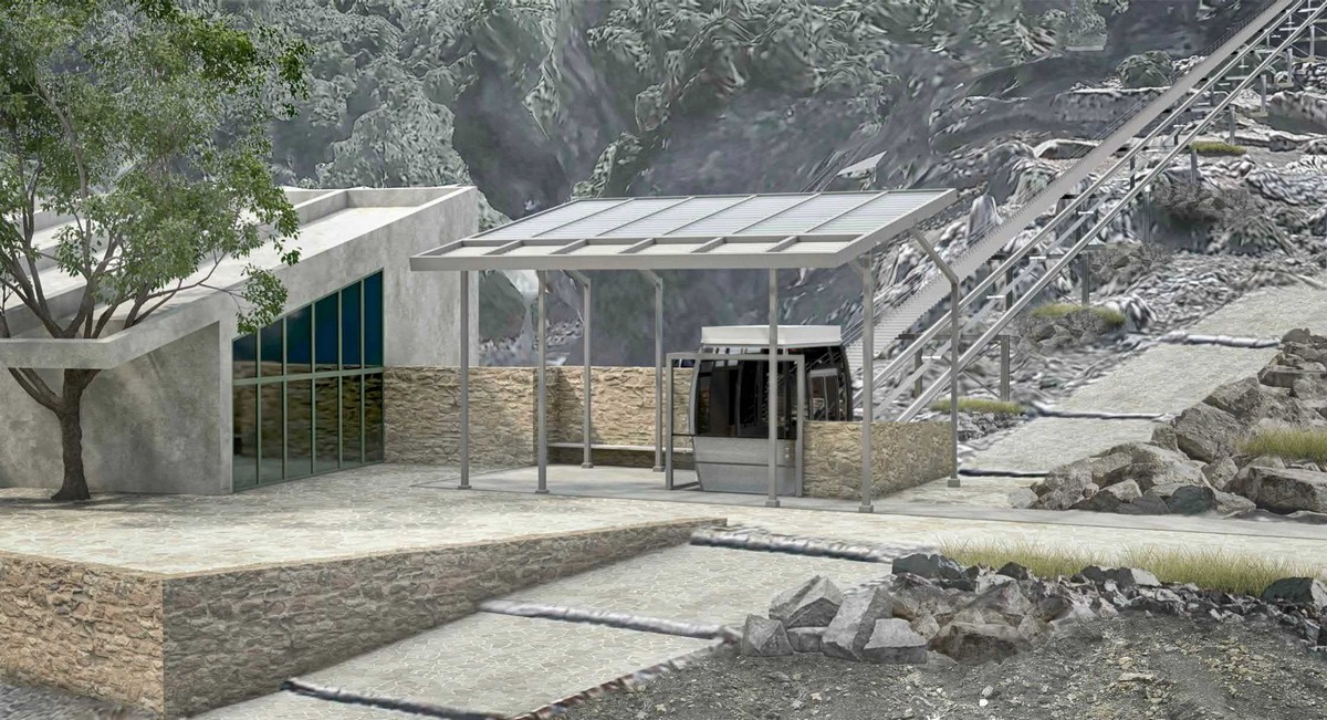 Ο σταθμός αφετηρίας του ανελκυστήρα προβλέπεται να είναι στο επίπεδο +878,20, στάθμη ενδιάμεση από την Πλατεία Ευρώπης και την είσοδο στο Τουριστικό Περίπτερο Ξενία. Για την πρόσβαση στη στάθμη αφετηρίας οι επισκέπτες μπορούν να φτάσουν πεζοί, από το νέο διαμορφωμένο μονοπάτι που ξεκινάει από την Πλατεία και οι επισκέπτες ΑμεΑ, με τον κατακόρυφο ανελκυστήρα που ξεκινάει από την Πλατεία και σταματά στα δύο επίπεδα ενδιαφέροντος: Επίπεδο αφετηρίας ανελκυστήρα και χώρων υγιεινής και επίπεδο τουριστικού περιπτέρου. Το κτήριο αφετηρίας είναι υπόγειο, ώστε να μην κυριαρχεί στη συνολική ανάπλαση της Πλατείας. Το κτήριο άφιξης του επικλινούς ανελκυστήρα είναι χωροθετημένο σε στάθμη για την ομαλή πρόσβαση από και προς τα εκδοτήρια των εισιτηρίων, στην είσοδο του Σπηλαίου. Δημιουργείται νέο μονοπάτι, το οποίο οι επισκέπτες μπορούν να χρησιμοποιούν για να κινηθούν ανάμεσα στα εκδοτήρια εισιτηρίων του Σπηλαίου και στο σταθμό άφιξης του επικλινούς ανελκυστήρα. Τα υλικά επιλέχθηκαν ώστε να αξιοποιηθούν τα προϊόντα εκσκαφής, το κτήριο να ενσωματωθεί στο φυσικό περιβάλλον δημιουργώντας ένα δροσερό περιβάλλον αναμονής, για χωρίς την χρήση μηχανικών μέσων.