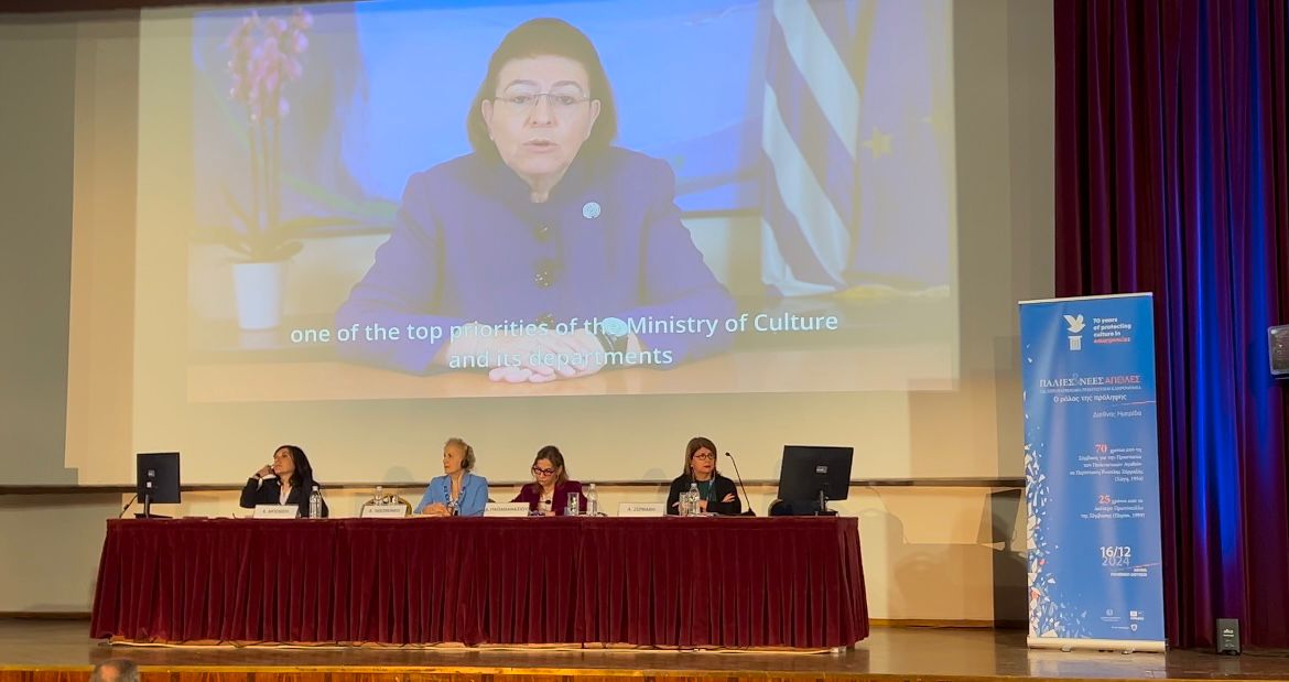 H Υπουργός Πολιτισμού Λίνα Μενδώνη απηύθυνε χαιρετισμό στη Διεθνή Ημερίδα, που οργάνωσε το Υπουργείο Πολιτισμού -δια της Διεύθυνσης Προϊστορικών και Κλασικών Αρχαιοτήτων της Γενικής Διεύθυνσης Αρχαιοτήτων και Πολιτιστικής Κληρονομιάς- με αφορμή τη συμπλήρωση 70 χρόνων από τη Σύμβαση για την Προστασία των Πολιτιστικών Αγαθών σε Περίπτωση Ένοπλης Σύρραξης (Χάγη, 1954) και 25 χρόνων από το Δεύτερο Πρωτόκολλο της Σύμβασης (Παρίσι, 1999): «Παλιές και νέες απειλές για την Παγκόσμια Πολιτιστική Κληρονομιά. Ο ρόλος της πρόληψης». Η ημερίδα φιλοξενήθηκε στο Αμφιθέατρο Ι. Καποδίστριας, στο Πολεμικό Μουσείο της Αθήνας.