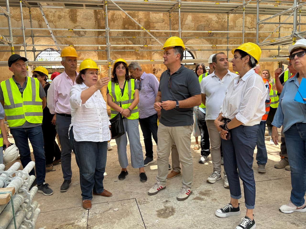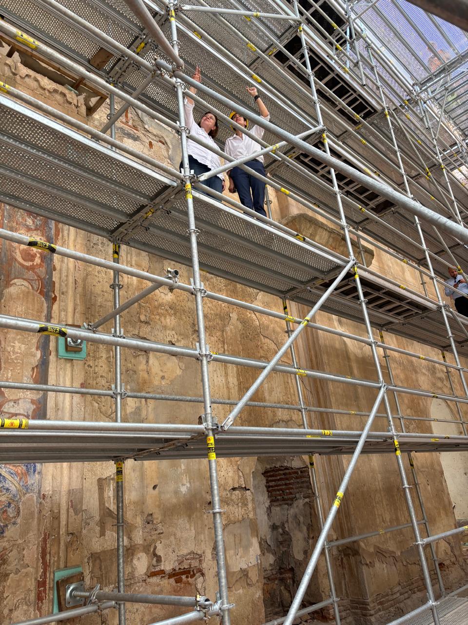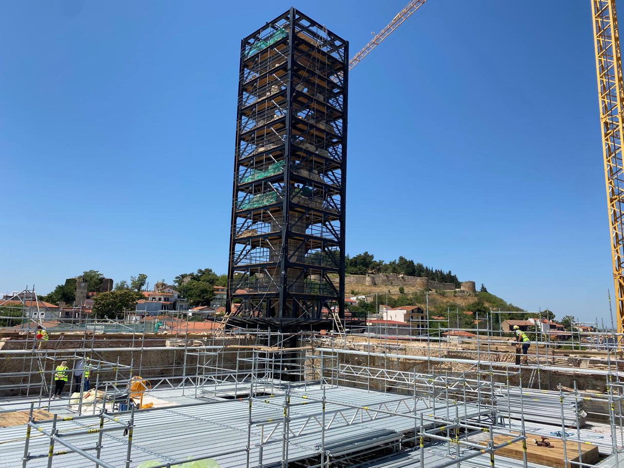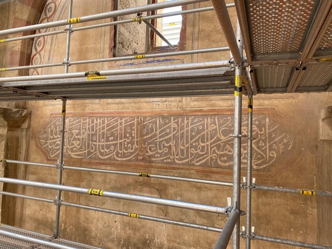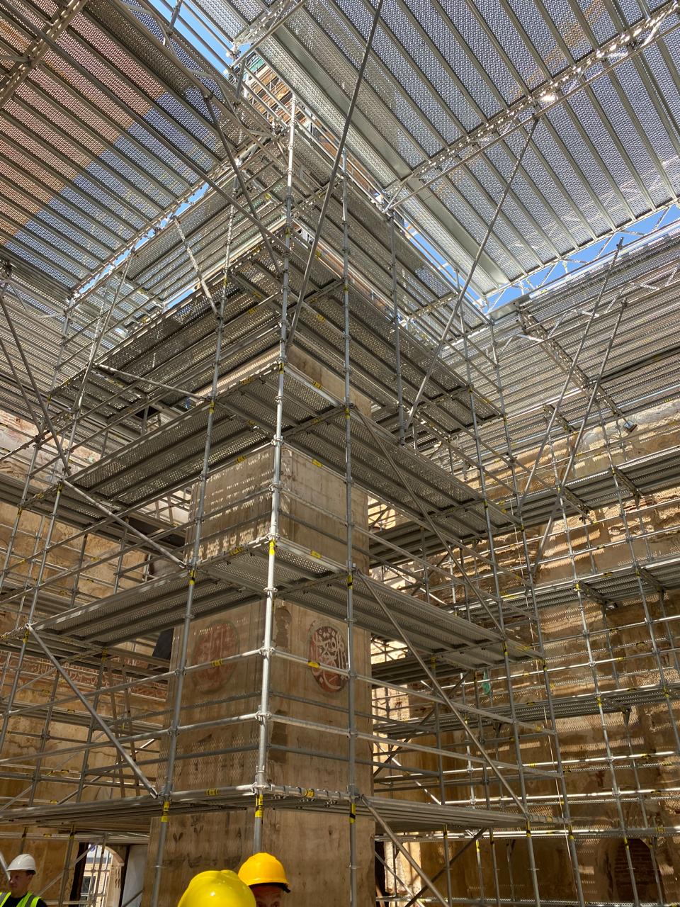 Η Υπουργός, ανεβαίνοντας στις υψηλότερες στάθμες των ικριωμάτων εργασίας, που φτάνουν τα 18 μέτρα, είχε την ευκαιρία να δει το έργο κατασκευής της ξύλινης οροφής του μνημείου και της αποκατάστασης του μιναρέ. Πρόκειται για φυσική ξυλεία χλωρής δρυός, ιδιαίτερα μεγάλων διατομών και μήκους -κάποιοι δοκοί έχουν διατομή 0,35Χ0,45 και μήκος 13,5μ.- που προέρχεται από αειφόρα διαχειριζόμενα δάση της Γαλλίας, της Ελβετίας και της Γερμανίας. Η ξυλεία που χρησιμοποιείται στην ανακατασκευή της στέγης του τεμένους, διαμορφώθηκε ως προς τις διαστάσεις και πιστοποιήθηκε ως προς την αντοχή, από αντίστοιχα τοπικά πριστήρια, σύμφωνα με τις προδιαγραφές που έχουν τεθεί από την εγκεκριμένη μελέτη. Ήδη έχει τοποθετηθεί το μεγαλύτερο τμήμα των ξύλων της έδρασης της στέγης στην στέψη των τοίχων και των πρώτων στρώσεων στους εσωτερικούς πεσσούς του μνημείου. Παράλληλα, είναι σε εξέλιξη η αποδόμηση του μιναρέ μέχρι τη στέψη της τοιχοποιίας, προκειμένου να ολοκληρωθεί η δομική του αποκατάσταση, με επαναχρησιμοποίηση του υλικού που δεν έχει φθαρεί από την πυρκαγιά, και τη συμπλήρωσή του, με νέο υλικό.