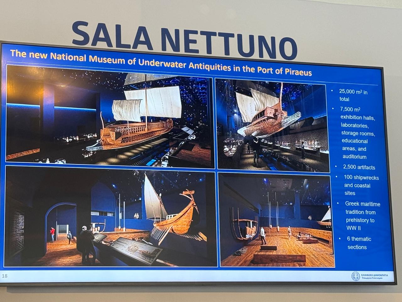 Εκτενή αναφορά έκανε στην ίδρυση του Εθνικού Μουσείου Εναλίων Αρχαιοτήτων, ενός εμβληματικού έργου το οποίο θα στεγαστεί στο κτήριο του ΣΙΛΟ, την π. σιταποθήκη της δεκαετίας του '30 στο λιμάνι του Πειραιά. Η ίδρυση του Μουσείου, πέραν της ανάδειξής του σε τοπόσημο, στο μεγαλύτερο λιμάνι της χώρας μας, συμπληρώνει ένα σημαντικό κενό στο μουσειακό χάρτη της πατρίδας μας. Η Ελλάδα, κατ΄ εξοχήν ναυτική χώρα, δεν διαθέτει μέχρι σήμερα ένα Μουσείο για την προβολή της ενάλιας πολιτιστικής της κληρονομιάς της, από την απώτατη προϊστορία ως τον Β΄ Παγκόσμιο Πόλεμο. Μέσα από περιβαλλοντικές και τεχνολογικές καινοτομίες, το Μουσείο ιδρύεται για να αποτελέσει σημείο αναφοράς, όχι μόνο στη μουσειολογική του σύλληψη και τα εκθέματα υψηλής αξίας που θα φιλοξενεί, αλλά και ως εκπαιδευτικό και συνεδριακό κέντρο, διεθνούς ακτινοβολίας.