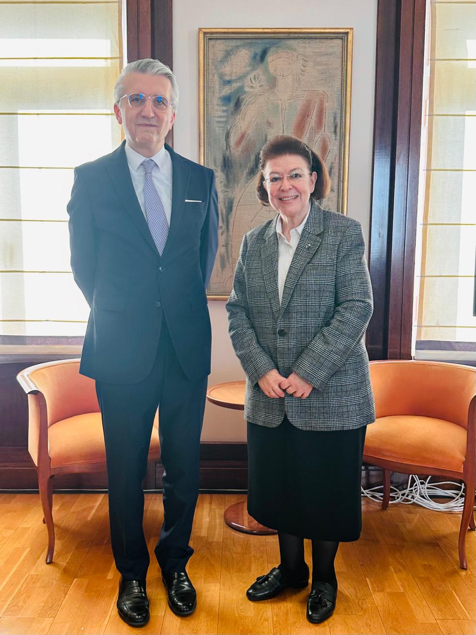 Σε ό,τι αφορά τη συνάντηση με τον Πρέσβη της Τουρκίας, Çağatay Erciyes, η Υπουργός αναφέρθηκε στα συμφωνηθέντα με τον Υπουργό Πολιτισμού και Τουρισμού της Τουρκίας, Mehmet Ersoy, στο πλαίσιο του Ανώτατου Συμβουλίου Συνεργασίας, καθώς και στους τρόπους υποστήριξης της υλοποίησής τους. Σε συνέχεια της υπογραφής Μνημονίου Κατανόησης στην Άγκυρα, για συνεργασία στον πολιτισμό —που περιλαμβάνει δράσεις τόσο για την πολιτιστική κληρονομιά, όσο και για τον σύγχρονο δημιουργικό τομέα— συμφωνήθηκε η διοργάνωση συνεδρίου στην Καππαδοκία, με τη συμμετοχή εμπειρογνωμόνων από τις δύο χώρες. Το συνέδριο θα επικεντρωθεί στην ανταλλαγή εμπειριών και τεχνογνωσίας σχετικά με τη συντήρηση μνημείων, όλων των ιστορικών περιόδων, καθώς και στην αντιμετώπιση της παράνομης διακίνησης αρχαιοτήτων. Αντίστοιχη διοργάνωση προβλέπεται να πραγματοποιηθεί και στην Ελλάδα, το προσεχές Φθινόπωρο. Τέλος, εξετάστηκε η προοπτική ανταλλαγής περιοδικών εκθέσεων. Από τουρκικής πλευράς προτάθηκε η παρουσίαση της έκθεσης για τον προϊστορικό αρχαιολογικό χώρο Göbekli Tepe, που τώρα εκτίθεται στο Κρατικό Μουσείο του Βερολίνου, ενώ από ελληνικής πλευράς προτάθηκε η έκθεση «Οι Αμέτρητες Όψεις του Ωραίου» του Εθνικού Αρχαιολογικού Μουσείου η οποία έχει παρουσιαστεί σε σημαντικούς διεθνείς προορισμούς, με μεγάλη επιτυχία.