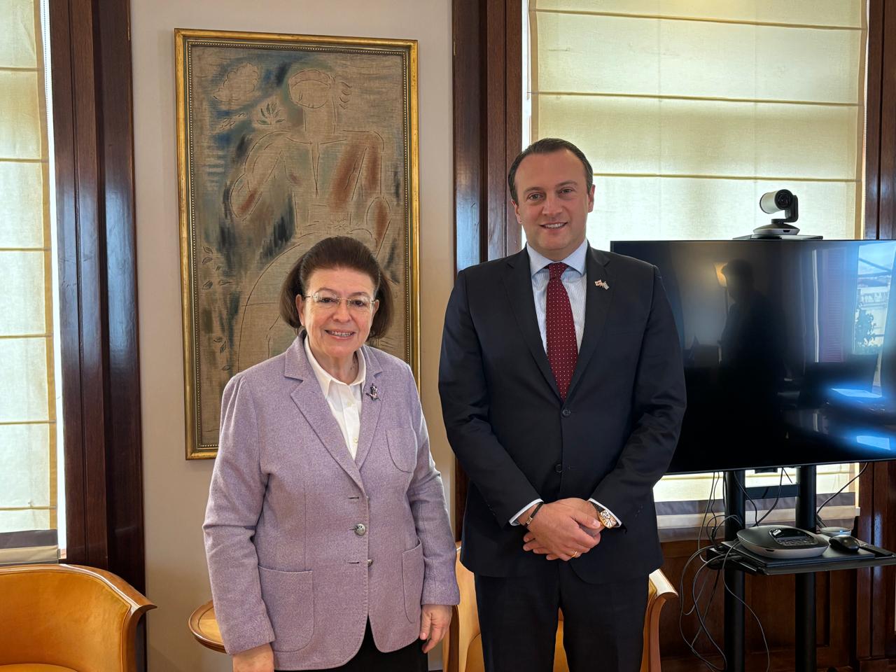 Αντίστοιχα, με τον Πρέσβη της Γεωργίας, Levan Beridze, η συζήτηση επικεντρώθηκε στην επικείμενη επίσκεψη της Υπουργού Πολιτισμού της Γεωργίας, Tinatin Ruhkadze, στην Ελλάδα. Η επίσκεψη της ομολόγου της αναμένεται να αναδείξει τους ιστορικούς δεσμούς των δύο χωρών και τη δημιουργία νέων προοπτικών συνεργασίας. Στο πλαίσιο αυτό προγραμματίζεται, παρουσία των δύο Υπουργών, γεωργιανή παράσταση στην Εθνική Λυρική Σκηνή. Επιπλέον, συζητήθηκε η πρόταση για κοινή έκθεση ιστορικών χειρογράφων που φυλάσσονται σε πολιτιστικά ιδρύματα και βιβλιοθήκες καθώς και η υλοποίηση προγράμματος μεταφράσεων λογοτεχνικών έργων. Έμφαση δόθηκε, επίσης, στη συνεργασία για την προστασία και τη συντήρηση της πολιτιστικής κληρονομιάς, μέσω άμεσης ανταλλαγής τεχνογνωσίας μεταξύ των αρμόδιων υπηρεσιών.