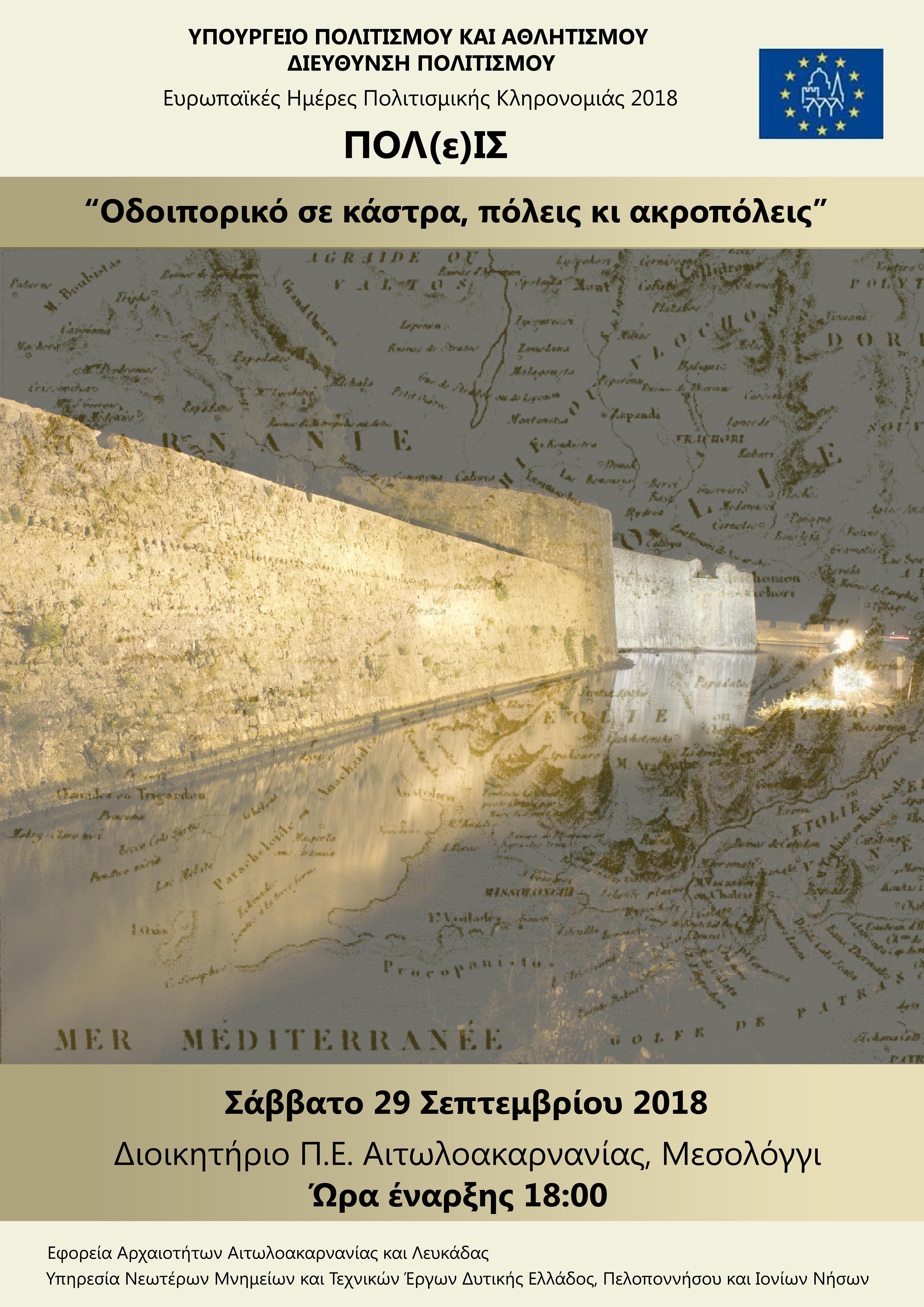 Η Εφορεία Αρχαιοτήτων Αιτωλοακαρνανίας και Λευκάδος, συμμετέχοντας για έκτη συνεχή χρονιά στον εορτασμό των Ευρωπαϊκών Ημερών Πολιτιστικής Κληρονομιάς, διοργανώνει σε συνεργασία με την Υπηρεσία Νεωτέρων Μνημείων και Τεχνικών έργων Δυτικής Ελλάδος, Πελοποννήσου και Ιονίων Νήσων Ημερίδα με θέμα «Οδοιπορικό σε κάστρα, πόλεις κι ακροπόλεις», το Σάββατο 29 Σεπτεμβρίου και ώρα 18:00 στο Διοικητήριο Π.Ε. Αιτωλοακαρνανίας.Οι Ευρωπαϊκές Ημέρες Πολιτιστικής Κληρονομιάς διοργανώθηκαν για πρώτη φορά από το Υπουργείο Πολιτισμού το 1984 και από τότε πραγματοποιούνται κάθε χρόνο το τρίτο Σαββατοκύριακο του Σεπτέμβρη, με στόχο να προβάλουν την εκπαιδευτική αξία της πολιτιστικής κληρονομιάς και να προωθήσουν τρόπους διαχείρισής της, μέσα από διάφορες πρωτοβουλίες.Το θέμα που επιλέχτηκε από τη Διεύθυνση Μουσείων του ΥΠΠΟΑ για τη διετία 2017-2018 είναι αφιερωμένο στην/στις «πόλ(ε)ις». Πόλεις παλιές και νέες, μεγάλες ή μικρότερες, σημαντικές ή λιγότερο σπουδαίες, ζωντανές ή ξεχασμένες θα αφηγηθούν μια διαφορετική ιστορία για την μεταμόρφωσή τους στο σύγχρονο κόσμο και την πορεία τους στο μέλλον. Καστροπολιτείες, πόλεις και ακροπόλεις της περιοχής της Αιτωλοακαρνανίας, με ιδιαίτερα πλούσιο ιστορικό και πολιτιστικό υπόβαθρο από την αρχαιότητα έως σήμερα, θα αποτελέσουν τον κεντρικό άξονα της ημερίδας μας, με σκοπό την προβολή της τοπικής πολιτιστικής κληρονομιάς.Το πρόγραμμα της ημερίδας διαμορφώνεται ως εξής: