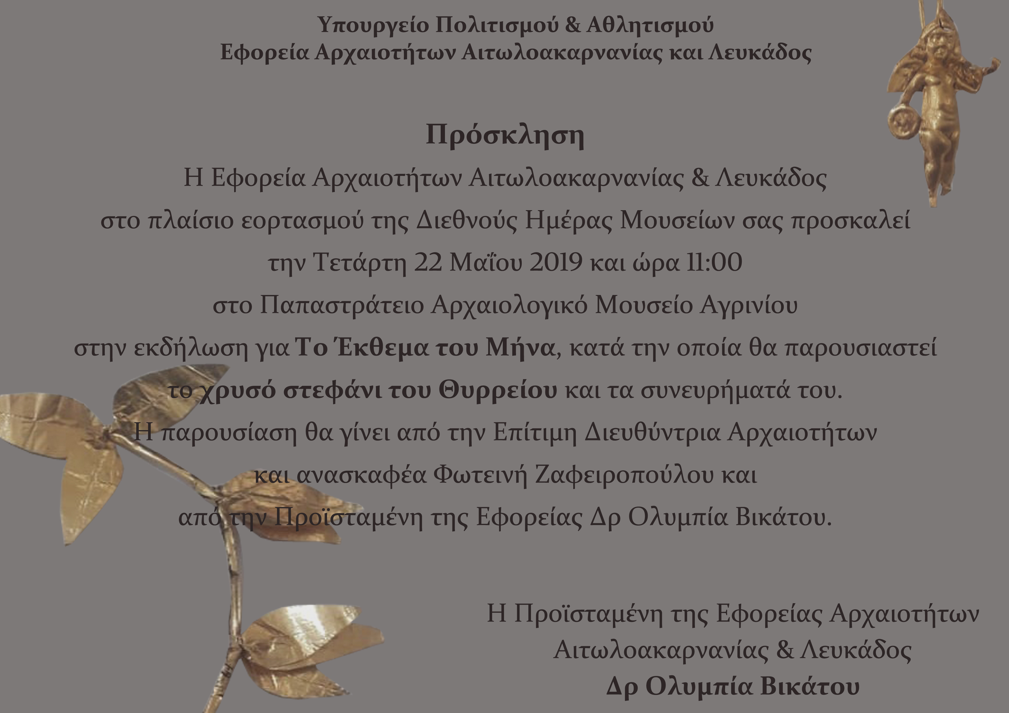 Η Εφορεία Αρχαιοτήτων Αιτωλοακαρνανίας και Λευκάδος με αφορμή τον εορτασμό της Διεθνούς Ημέρας Μουσείων διοργανώνει την Τετάρτη 22 Μαΐου 2019 και ώρα 11:00 στο Παπαστράτειο Αρχαιολογικό Μουσείο Αγρινίου εκδήλωση για το Έκθεμα του Μήνα, κατά την οποία θα παρουσιαστεί για πρώτη φορά στο ευρύ κοινό μετά την ανακάλυψή του το 1973, το χρυσό στεφάνι του Θυρρείου και τα συνευρήματά του. Το σπουδαίο αυτό ανασκαφικό σύνολο εντοπίστηκε σε κιβωτιόσχημο τάφο, που ερευνήθηκε κατά τη διάρκεια εργασιών διάνοιξης υδρευτικής αύλακας εντός του Θυρρείου και περιείχε μια πλούσια κτερισμένη γυναικεία ταφή της ελληνιστικής περιόδου (α΄ μισό 2ου αι. π.Χ.) και μία μεταγενέστερη ταφή-καύση των αυτοκρατορικών χρόνων (1ος-2ος αι. μ.Χ.). Η νεκρή έφερε χρυσό στεφάνι από φύλλα μυρτιάς στην κεφαλή και χρυσό ενώτιο. Τα υπόλοιπα κτερίσματα, τρεις χάλκινοι καθρέφτες, σιδερένια στλεγγίδα, δύο θαλάσσιες αχιβάδες και 26 πήλινα αγγεία (λύχνοι, αρύβαλλοι, κυάθια, σκυφίδια, μυροδοχεία, πυξίδες κ.ά.) βρέθηκαν συγκεντρωμένα στα πόδια της. Η μεταγενέστερη ταφή-καύση των αυτοκρατορικών χρόνων βρέθηκε μέσα σε μόνωτη χύτρα, η οποία περιείχε τα καμένα οστά και ένα μικρό γυάλινο αγγείο.Η παρουσίαση του εκθέματος θα γίνει από την Επίτιμη Διευθύντρια Αρχαιοτήτων και ανασκαφέα Φωτεινή Ζαφειροπούλου και την Προϊσταμένη της Εφορείας Αρχαιοτήτων Δρ Ολυμπία Βικάτου. Θα ακολουθήσει ξενάγηση στους εκθεσιακούς χώρους του Μουσείου από αρχαιολόγους της Εφορείας. Κατά την εκδήλωση θα τιμηθεί η Επίτιμη Έφορος Αρχαιοτήτων Φωτεινή Ζαφειροπούλου για τη συμβολή της στην έρευνα, προστασία και ανάδειξη της πολιτιστικής κληρονομιάς της Αιτωλοακαρνανίας.Το Αρχαιολογικό Μουσείο Αγρινίου θα παραμένει ανοιχτό για τους επισκέπτες καθημερινά εκτός Τρίτης (8:00-15:30).
