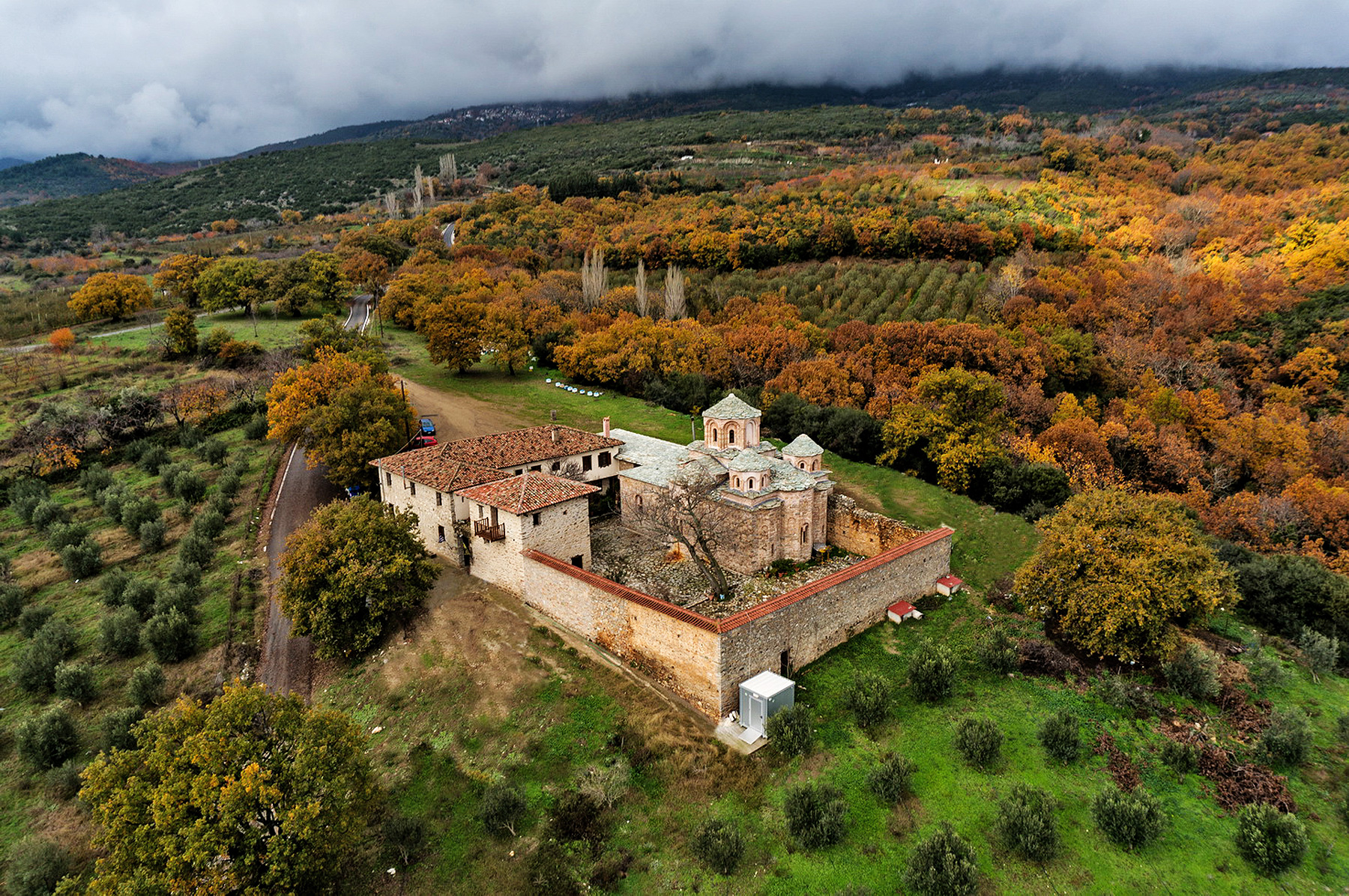 Η μονή βρίσκεται έξω από την Αγιά και το καθολικό της είναι αφιερωμένο στα Εισόδια της Θεοτόκου. Η αρχική φάση της μονής τοποθετείται στην τελευταία περίοδο του Βυζαντίου. Μετά την επανίδρυσή της τον 16ο αι., οπότε προστέθηκε η τιμή του Αγίου Παντελεήμονα, γνώρισε μια μεγάλη περίοδο ακμής μέχρι τον 19ο αι. Διαλύθηκε το 1881, ενώ κατοικήθηκε εκ νέου τη δεκαετία του 1980. Η μονή έχει φρουριακό χαρακτήρα και διασώζει μεγάλο μέρος από την κύρια ιστορική φάση του 16ο αι. Ο ζωγραφικός διάκοσμος του ναού ανήκει σε διάφορες φάσεις. Κατά τις πρόσφατες εργασίες συντήρησης αρχικά αντιμετωπίστηκαν τα προβλήματα υγρασίας στη στέγη και την τοιχοποιία. Μετά την ανάσυρση της παλαιάς στέγης από σχιστόπλακες πραγματοποιήθηκαν μόνο επιφανειακές εργασίες συντήρησης. Συγκεκριμένα, δημιουργήθηκαν οι κατάλληλες ρύσεις από περλιτόδεμα, τοποθέτηση υγρομονωτικής μεμβράνης και διάστρωση ασβεστοκονιοδέματος πάχους 5 εκ., ενώ στη συνέχεια επιστρώθηκαν νέες σχιστόπλακες ημικολυμβητές. Έγινε επισκευή των φθαρμένων αρμολογημάτων στη λιθοδομή των τρούλων, κυρίως στη βόρεια πλευρά και δημιουργήθηκε αποστραγγιστική τάφρος βόρεια της μονής για την καταπολέμηση της ανερχόμενης υγρασίας. Η υγρασία είχε προκαλέσει εκτεταμένες φθορές στις τοιχογραφίες με απώλεια της ζωγραφικής επιφάνειας και του κονιάματος, απολέπιση και κονιορτοποίηση των χρωστικών καθώς και επικαθίσεις αλάτων. Επίσης διαπιστώθηκαν εκτεταμένες επεμβάσεις επιχρωματισμών-επιζωγραφίσεων. Έγιναν διαγνωστικές εξετάσεις με τη μέθοδο της υπέρυθρης και υπεριώδους φωτογράφησης ανάκλησης, της υπεριώδους φωτογράφισης φθορισμού καθώς και της φασματοσκοπίας raman. Με τη διαδικασία αυτή διαπιστώθηκε η έκταση των φθορών και οι διάφορες φάσεις του ζωγραφικού διάκοσμου του καθολικού. Μετά τη στερέωση του σαθρού κα αποκολλημένου υποστρώματος της ζωγραφικής επιφάνειας, έγινε στερέωση του κονιοποιημένου ή απολεπισμένου ζωγραφικού στρώματος με ακρυλικά πολυμερή και πλήρωση των κενών του υποστρώματος με κονίαμα από ασβέστη. Καθαρίστηκαν οι τοιχογραφίες, αφαιρέθηκαν οι νεότερες επεμβάσεις. Επίσης το τέμπλο απεντομώθηκε και στερεώθηκε.