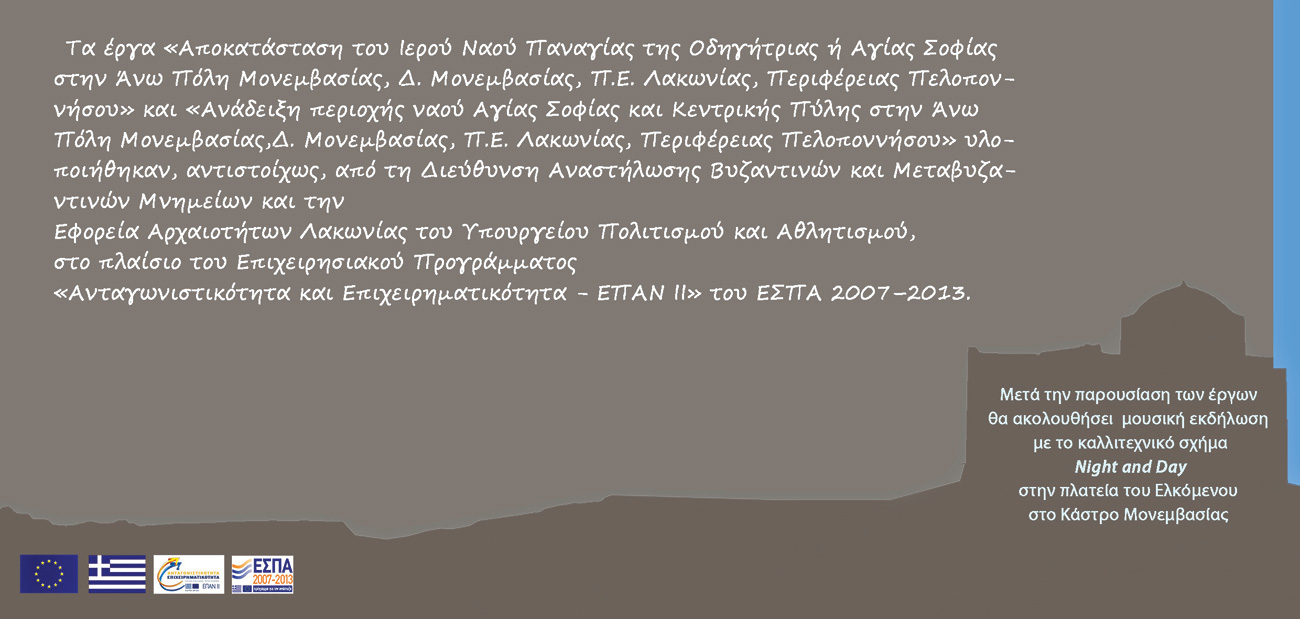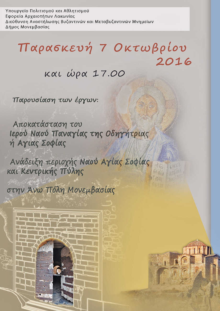 Παρουσίαση των έργων: «Αποκατάσταση του Ιερού Ναού Παναγίας της Οδηγήτριας ή Αγίας Σοφίας», «Ανάδειξη του περιοχής Ναού Αγίας Σοφίας και Κεντρικής Πύλης στην Άνω Πόλη Μονεμβασιάς»