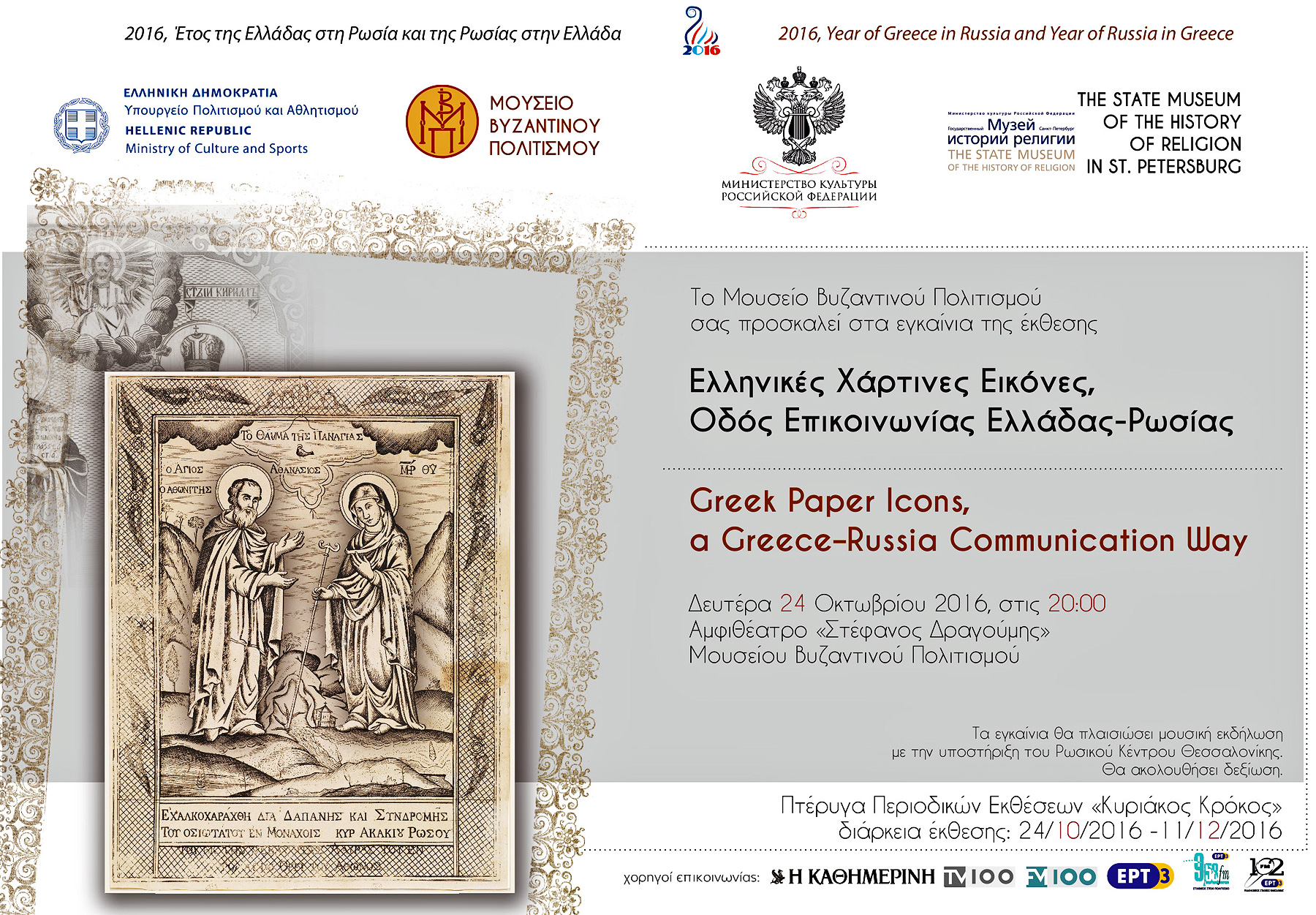 Εγκαίνια έκθεσης στο Μουσείο Βυζαντινού Πολιτισμού, με τίτλο «Ελληνικές Χάρτινες Εικόνες, Οδός Επικοινωνίας Ελλάδας-Ρωσίας» στο πλαίσιο του έτους 2016, Έτους της Ελλάδας στη Ρωσία και της Ρωσίας στην Ελλάδα (Πτέρυγα περιοδικών εκθέσεων «Κυριάκος Κρόκος», 24/10 – 11/12/2016)