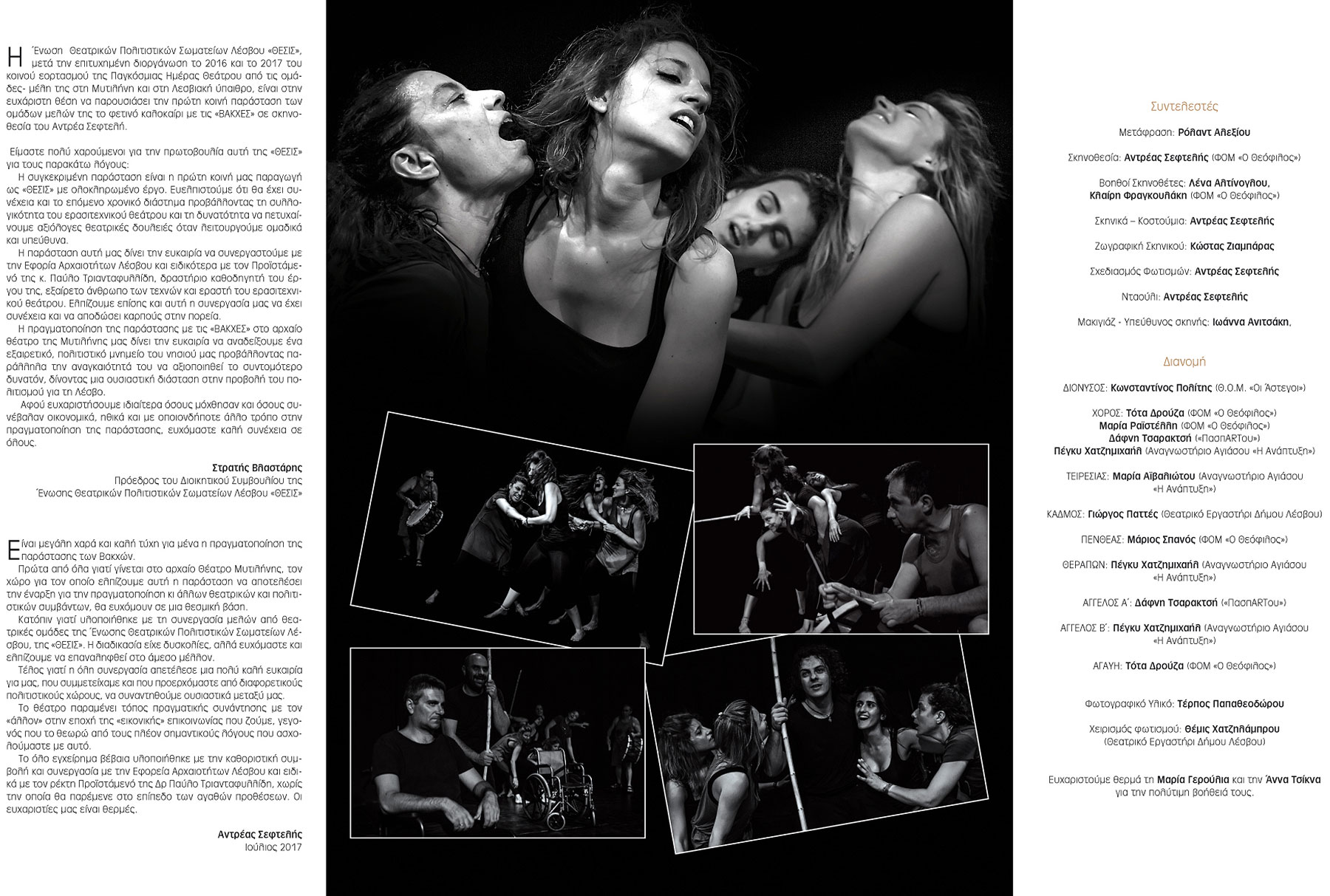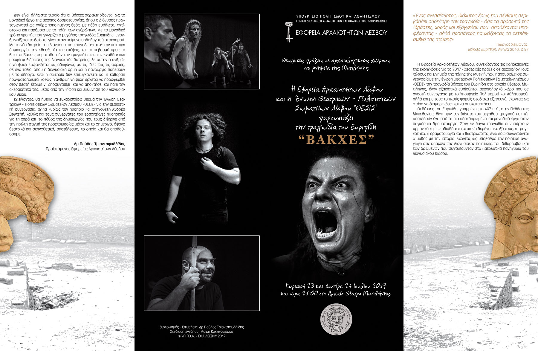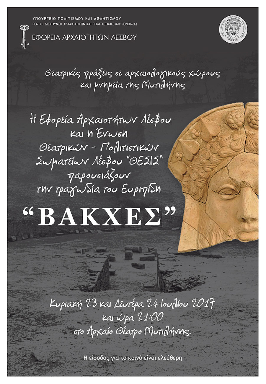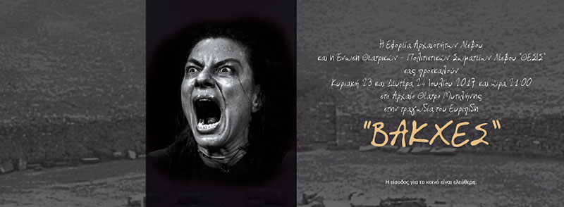 Η Εφορεία Αρχαιοτήτων Λέσβου στο πλαίσιο της θερινής πολιτιστικής εκδήλωσης για το έτος 2017 "Θεατρικές πράξεις σε μνημεία και αρχαιολογικούς χώρους της πόλης της Μυτιλήνης" παρουσιάζει σε συνεργασία με την Ένωση Θεατρικών-Πολιτιστικών Σωματείων Λέσβου "ΘΕΣΙΣ" τις ΒΑΚΧΕΣ του Ευριπίδη στις 23 και 24 Ιουλίου 2017 και ώρα 21.00 στο αρχαίο θέατρο Μυτιλήνης. Η είσοδος για το κοινό είναι ελεύθερη.