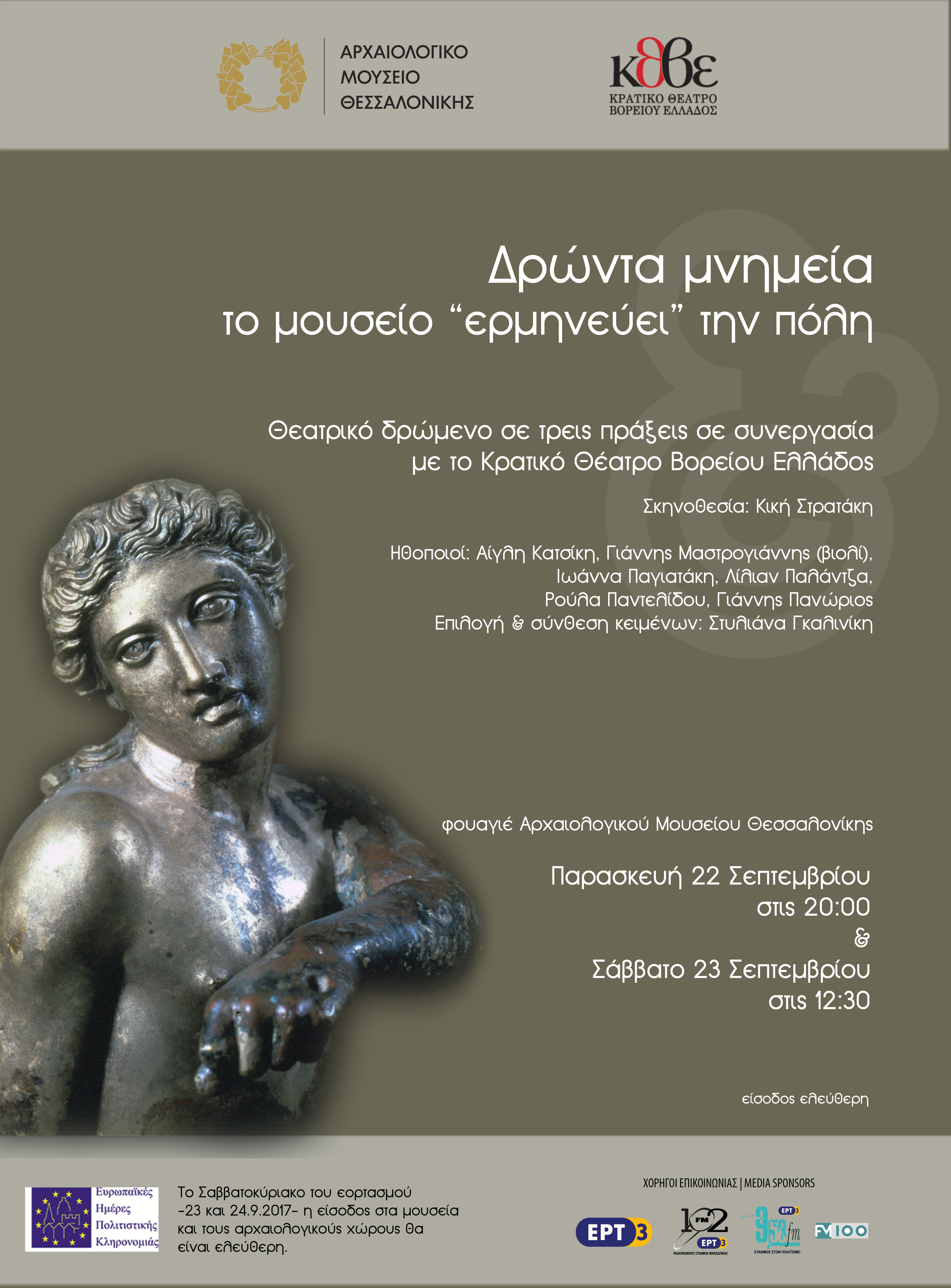 Στο πλαίσιο του εορτασμού των Ευρωπαϊκών Ημερών Πολιτιστικής Κληρονομιάς 2017 «ΠΟΛ(ε)ΙΣ», το Αρχαιολογικό Μουσείο σε συνεργασία με το Κρατικό Θέατρο Βορείου Ελλάδος παρουσιάζει το θεατρικό δρώμενο με τίτλο «Δρώντα μνημεία: Το μουσείο "ερμηνεύει" την πόλη».