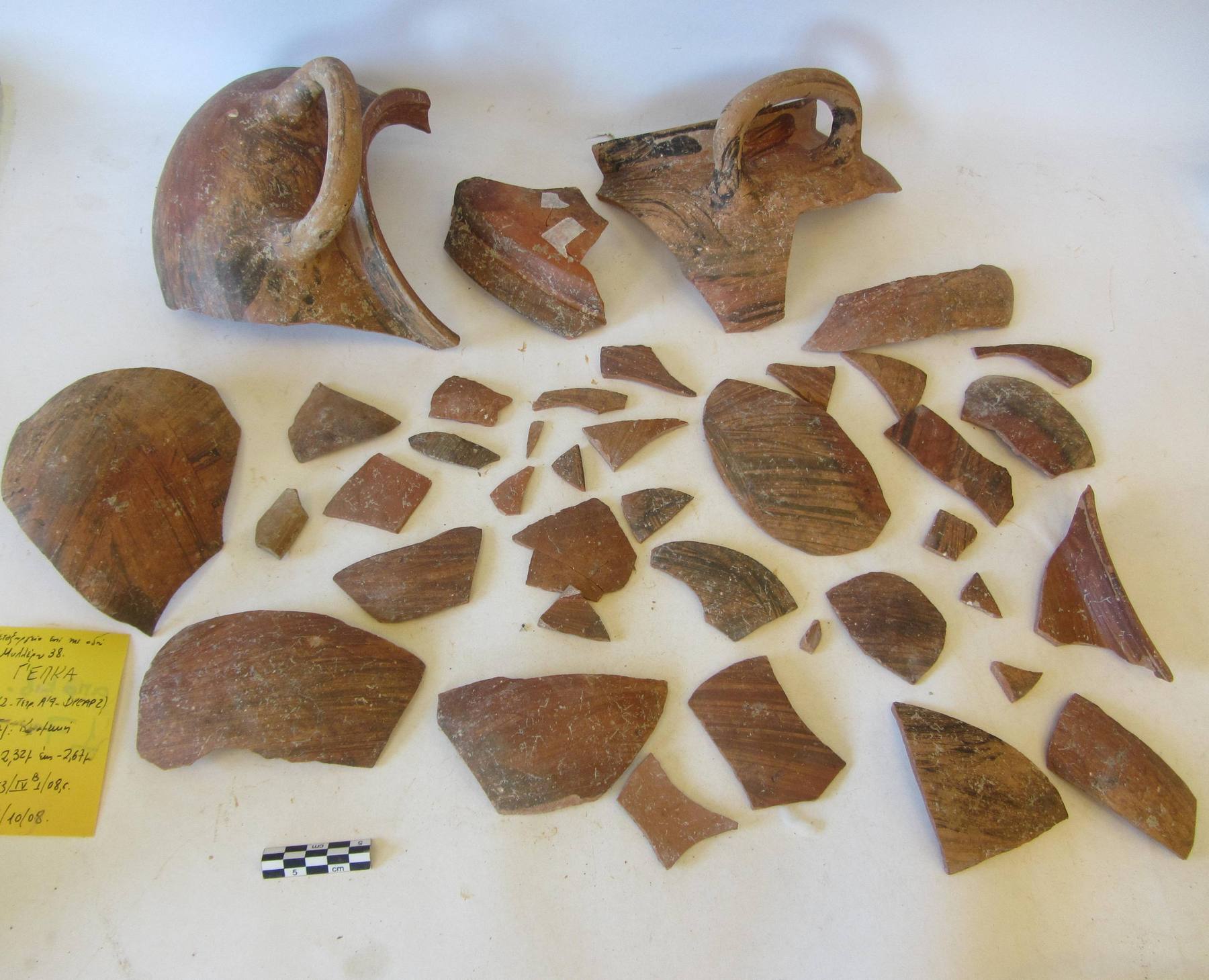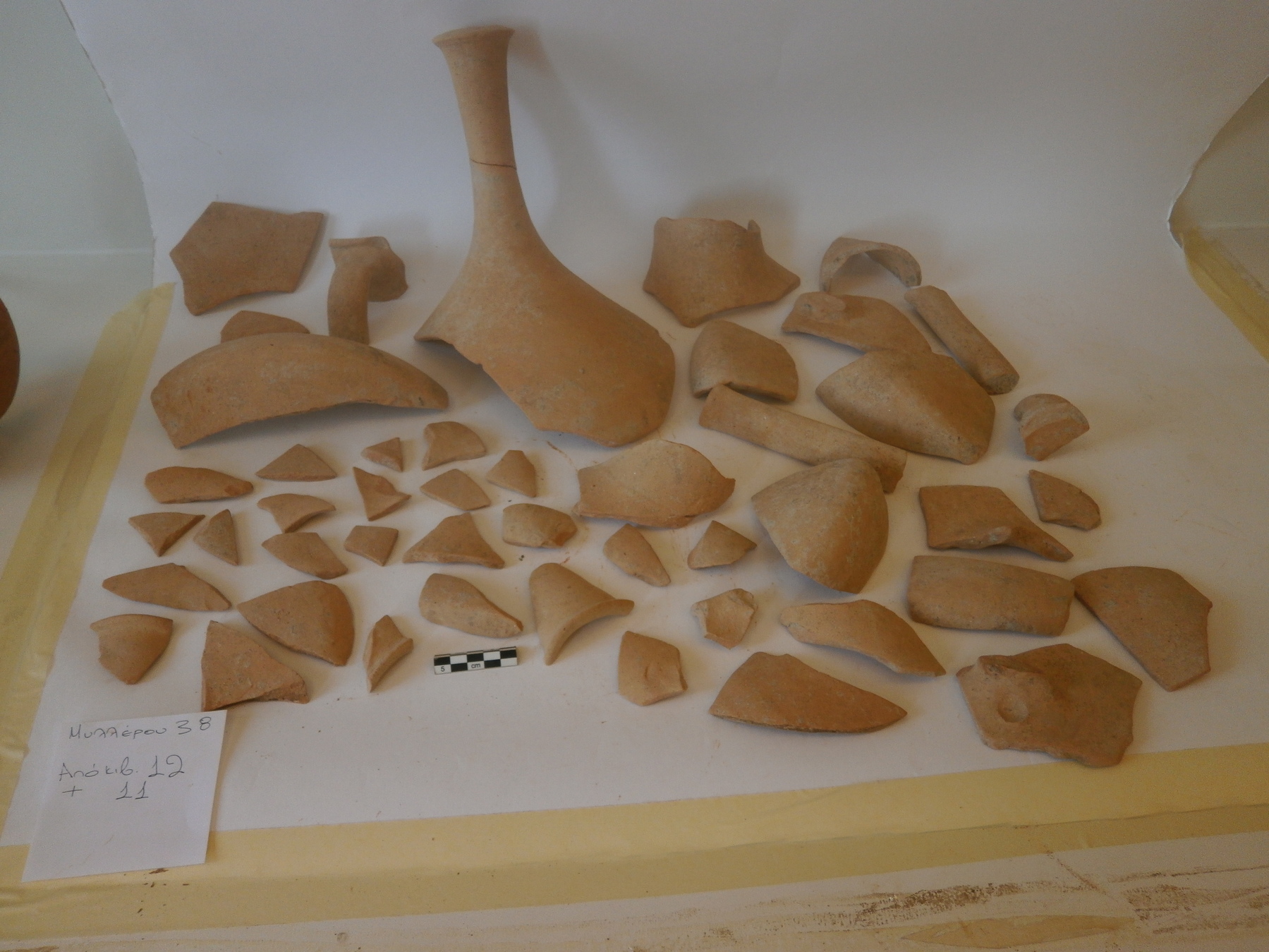 Αρχικά πραγματοποιήθηκε μακροσκοπική εξέταση των ευρημάτων και διαπιστώθηκε η καλή κατάσταση της επιφάνειας τους. Σε επόμενο στάδιο υλοποιήθηκαν οι εργασίες τεκμηρίωσης, δηλαδή συμπληρώθηκαν δελτία συντήρησης για κάθε σύνολο ευρημάτων (όστρακα (θραύσματα κεραμικής) και αντικείμενα), τα οποία φωτογραφήθηκαν πριν την έναρξη των εργασιών, αλλά και σε όλα τα στάδια συντήρησης τους. Εκτιμήθηκε η κατάσταση διατήρησης τους και αναπτύχθηκε η μεθοδολογία και ο προγραμματισμός των απαιτούμενων επεμβάσεων. Τα όστρακα καθαρίστηκαν με μηχανικό τρόπο και χρήση απιονισμένου νερού. Στη συνέχεια έγινε πρόχειρη συναρμολόγηση των οστράκων με χαρτοταινία και ακολούθησε η ανάταξη και η συγκόλληση τους. Μετά από έλεγχο περίπου δύομισι χιλιάδων οστράκων, βρέθηκαν συνανήκοντα όστρακα από τα οποία προέκυψαν εξήντα τέσσερα αντικείμενα. Ενδεικτικά αναφέρονται τα εξής: μαγειρικά σκεύη (χύτρα, αρύταινα, τηγανόσχημο σκεύος) και επτά αμφορείς. Μετά την ολοκλήρωση των εργασιών συντήρησης τα αντικείμενα συσκευάστηκαν με κατάλληλα υλικά και αποθηκεύτηκαν σε ελεγχόμενες περιβαλλοντικές συνθήκες.