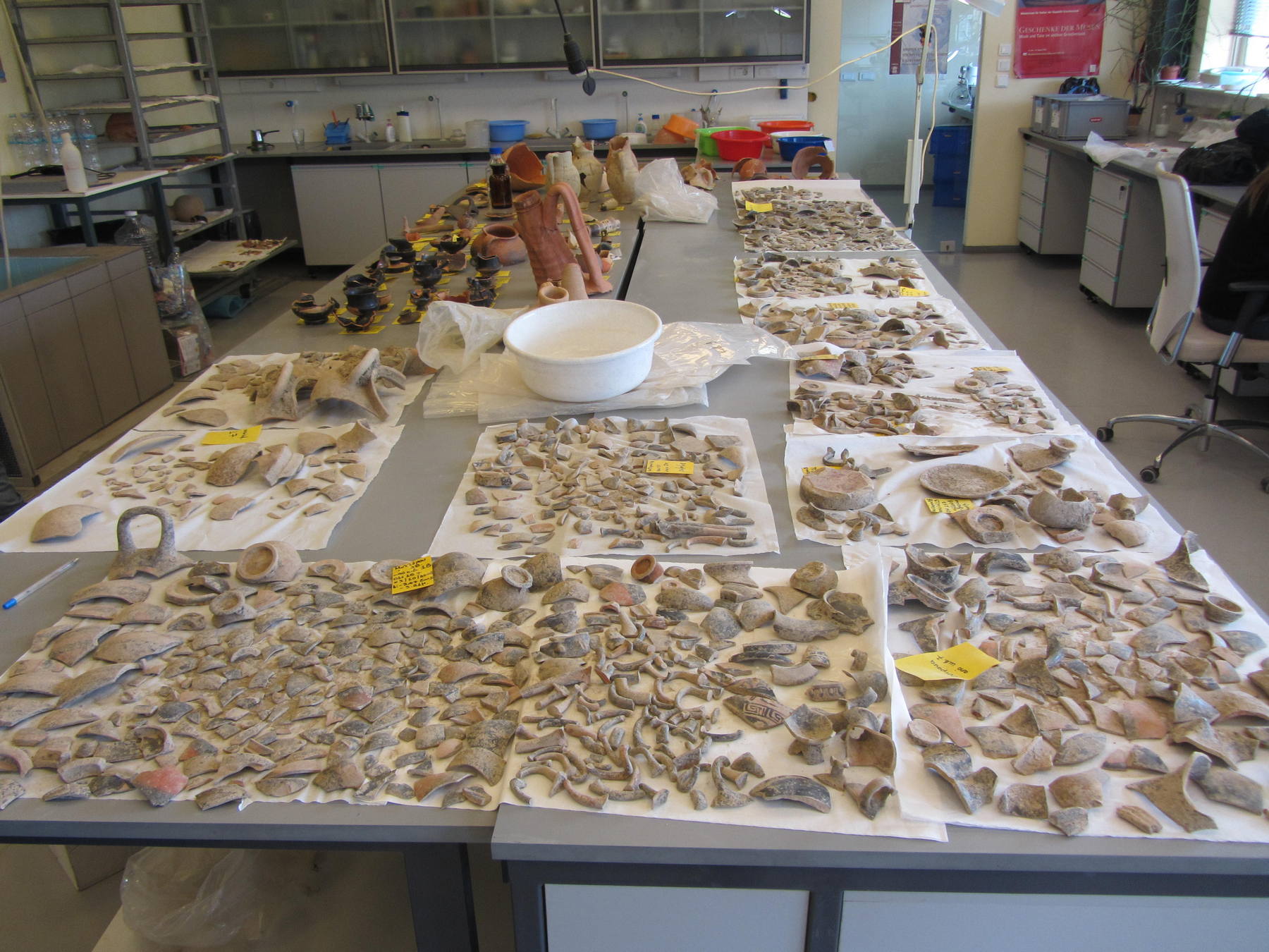 Αρχικά πραγματοποιήθηκε τεκμηρίωση, δηλαδή συμπληρώθηκαν δελτία συντήρησης για κάθε σύνολο ευρημάτων (όστρακα -θραύσματα κεραμικής- και αντικείμενα), τα οποία φωτογραφήθηκαν πριν την έναρξη των εργασιών, αλλά και σε όλα τα στάδια συντήρησης τους. Εκτιμήθηκε η κατάσταση διατήρησης τους και αναπτύχθηκε η μεθοδολογία και ο προγραμματισμός των απαιτούμενων επεμβάσεων. Τα όστρακα καθαρίστηκαν με μηχανικό τρόπο και χρήση απιονισμένου νερού. Στη συνέχεια έγινε πρόχειρη συναρμολόγηση των οστράκων και ακολούθησε η ανάταξη και η συγκόλληση τους. Μετά από έλεγχο περίπου δύομισι χιλιάδων οστράκων, βρέθηκαν συνανήκοντα όστρακα από τα οποία προέκυψαν εξήντα τέσσερα αντικείμενα. Ενδεικτικά αναφέρονται τα εξής: μαγειρικά σκεύη (χύτρα, αρύταινα, τηγανόσχημο σκεύος) και επτά αμφορείς. Μετά την ολοκλήρωση των εργασιών συντήρησης τα αντικείμενα συσκευάστηκαν με κατάλληλα υλικά και αποθηκεύτηκαν σε ελεγχόμενες περιβαλλοντικές συνθήκες.
