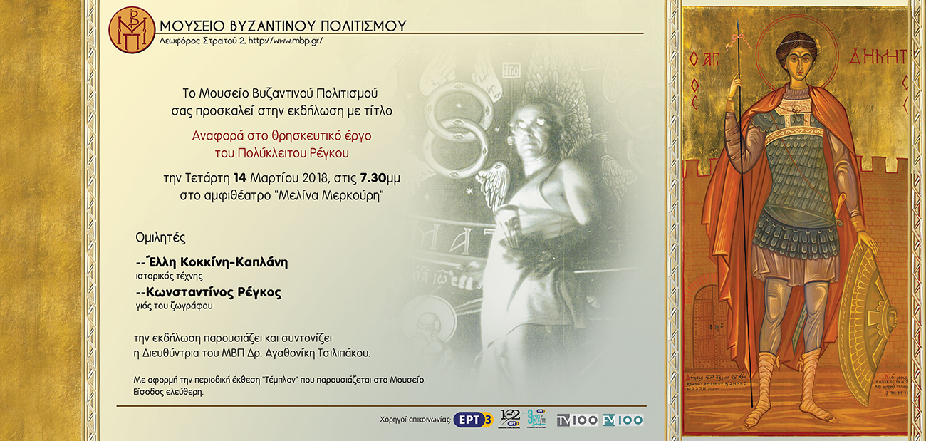 To Μουσείο Βυζαντινού Πολιτισμού σάς προσκαλεί στην εκδήλωση Αναφορά στο θρησκευτικό έργο του Πολύκλειτου Ρέγκου με αφορμή την έκθεση «Τέμπλον» στο Μουσείο Βυζαντινού Πολιτισμού την Τετάρτη 14 Μαρτίου 2018 στις 19.30 στο Αμφιθέατρο «Μελίνα Μερκούρη» του Μουσείου. Το έργο του ζωγράφου θα παρουσιάσει πάνελ με την ιστορικό τέχνης κα. Έλλη Κοκκίνη-Καπλάνη και τον γιο του καλλιτέχνη, κ. Κωνσταντίνο Ρέγκο, ενώ τον συντονισμό θα αναλάβει η διευθύντρια του ΜΒΠ, δρ Αγαθονίκη Τσιλιπάκου.