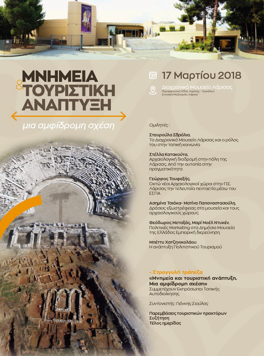 Η πρωτοφανής αυτή δραστηριότητα θα περίμενε κανείς να έχει σημαντική επίδραση στην αναγνωρισιμότητα της περιοχής ως τουριστικού προορισμού, καθώς και αντανάκλαση σε άλλους τομείς της οικονομίας. Η κατάσταση που διαμορφώνεται σήμερα και οι δυνατότητες ανάπτυξης της περιοχής θα παρουσιασθούν στην ημερίδα με θέμα Μνημεία και τουριστική ανάπτυξη. Μια αμφίδρομη σχέση, που οργανώνεται στο Διαχρονικό Μουσείο Λάρισας το Σάββατο 17 Μαρτίου. Αρχαιολόγοι της Εφορείας παρουσιάζουν το πρόσφατο αρχαιολογικό έργο, ενώ πανεπιστημιακοί, εκπρόσωποι της τοπικής αυτοδιοίκησης και παραγωγικών φορέων αναδεικνύουν τις δυνατότητες που διανοίγονται μέσα από αυτό, παρουσία προσκεκλημένων από τον τομέα του τουρισμού.