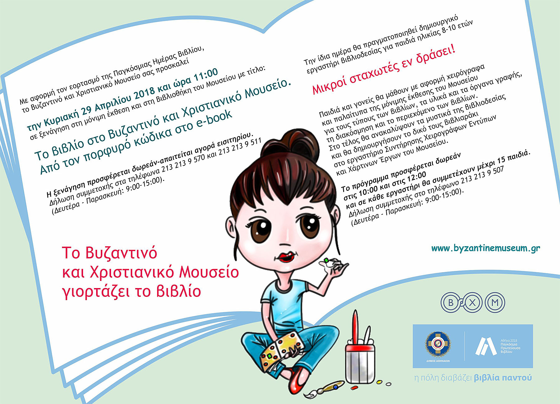 Με αφορμή τον εορτασμό της Παγκόσμιας Ημέρας Βιβλίου, το Βυζαντινό και Χριστιανικό Μουσείο διοργανώνει την Κυριακή 29 Απριλίου 2018 και ώρα 11:00 ξενάγηση στις μόνιμες συλλογές και στη Βιβλιοθήκη του Μουσείου με θέμα: «Το βιβλίο στο Βυζαντινό και Χριστιανικό Μουσείο. Από τον πορφυρό κώδικα στο e-book».