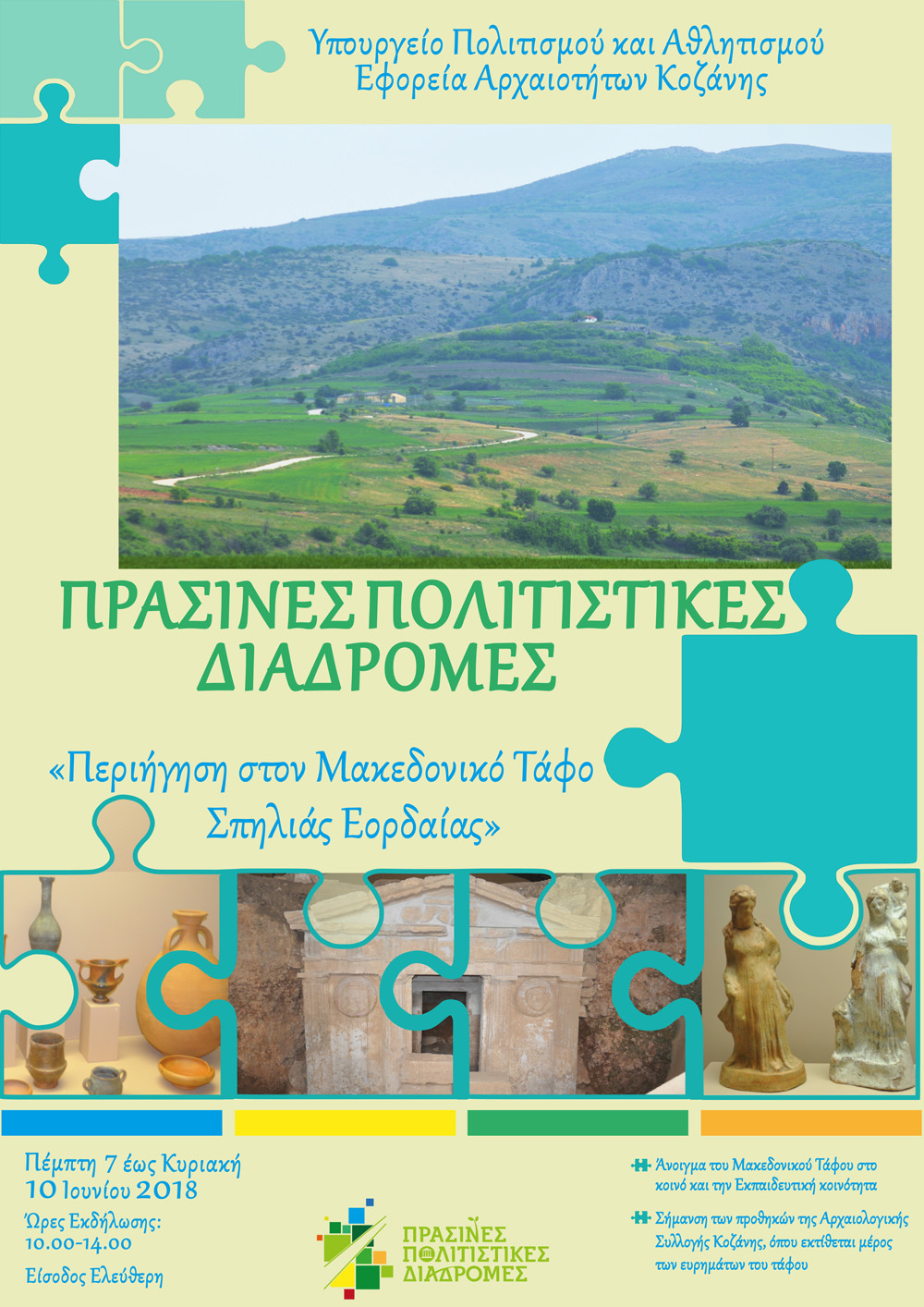 Η Εφορεία Αρχαιοτήτων Κοζάνης συμμετέχει και φέτος στον εορτασμό της επικοινωνιακής δράσης «Πράσινες Πολιτιστικές Διαδρομές», που για 7η συνεχή χρονιά διοργανώνει το Τμήμα Εκπαιδευτικών Προγραμμάτων και Επικοινωνίας της Διεύθυνσης Μουσείων του ΥΠ.ΠΟ.Α.