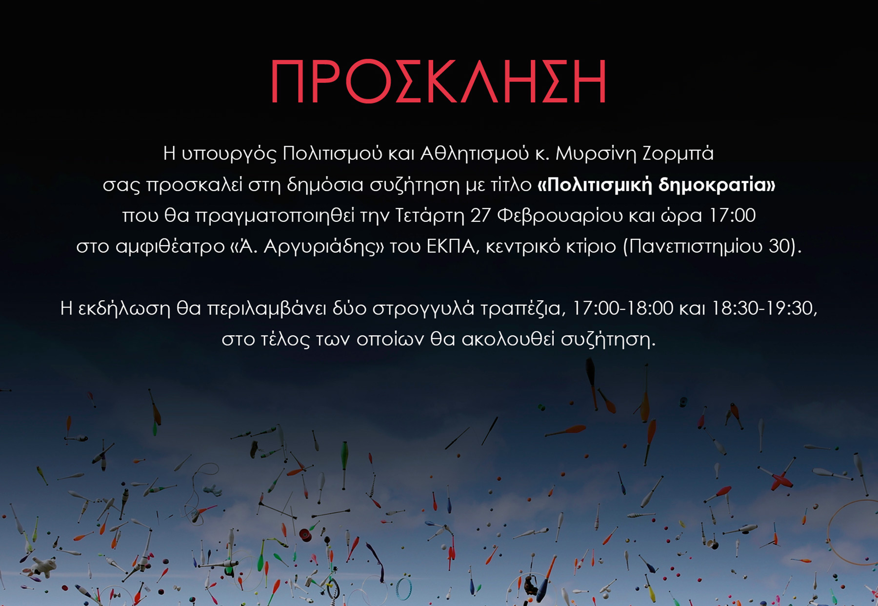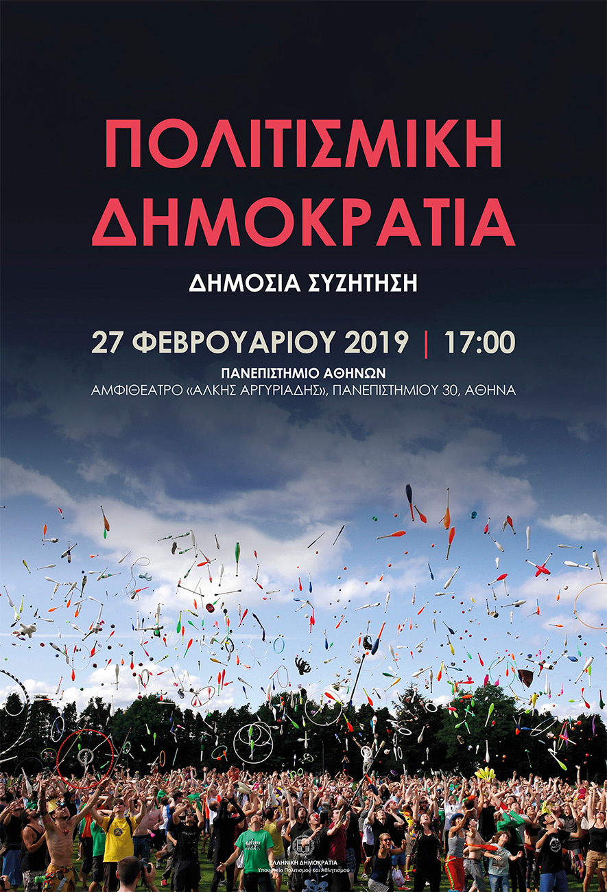 Δημόσια συζήτηση, με θέμα «Πολιτισμική Δημοκρατία» διοργάνωσε το Υπουργείο Πολιτισμού και Αθλητισμού, την Τετάρτη 27 Φεβρουαρίου στις 17:00, στο κεντρικό κτίριο του Εθνικού Καποδιστριακού Πανεπιστημίου (αμφιθέατρο Άλκης Αργυριάδης).