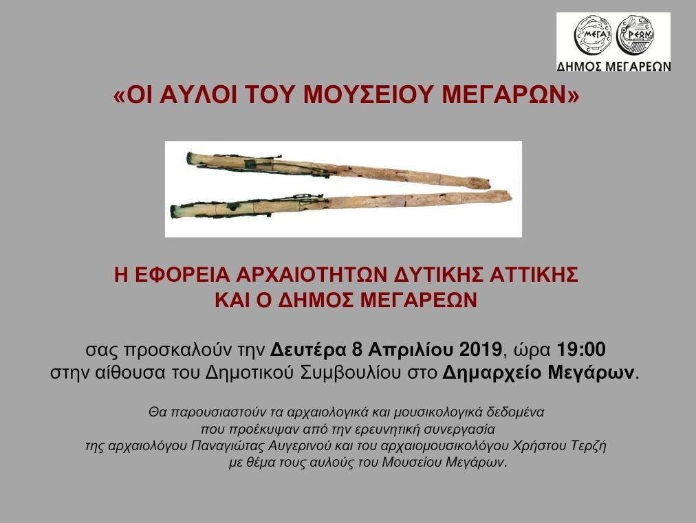 Η Εφορεία Αρχαιοτήτων Δυτικής Αττικής και ο Δήμος Μεγαρέων σας προσκαλούν τη Δευτέρα 8 Απριλίου 2019, ώρα 19:00 στην αίθουσα του Δημοτικού Συμβουλίου στο Δημαρχείο Μεγάρων. Θα παρουσιαστούν τα αρχαιολογικά και μουσικολογικά δεδομένα που προέκυψαν από την ερευνητική συνεργασία της αρχαιολόγου Παναγιώτας Αυγερινού και του αρχαιομουσικολόγου Χρήστου Τερζή με θέμα τους αυλούς του Μουσείου Μεγάρων.