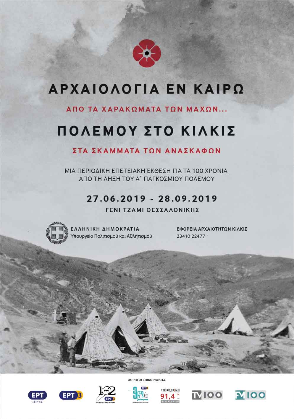 Η Εφορεία Αρχαιοτήτων Κιλκίς ανακοινώνει τη μεταφορά της περιοδικής επετειακής έκθεσης 'ΑΡΧΑΙΟΛΟΓΙΑ εν καιρώ ΠΟΛΕΜΟΥ στο ΚΙΛΚΙΣ. Από τα χαρακώματα των μαχών... στα σκάμματα των ανασκαφών' από το Αρχαιολογικό Μουσείο Κιλκίς στο Γενί Τζαμί Θεσσαλονίκης με διάρκεια από 27 Ιουνίου 2019 έως 28 Σεπτεμβρίου 2019.