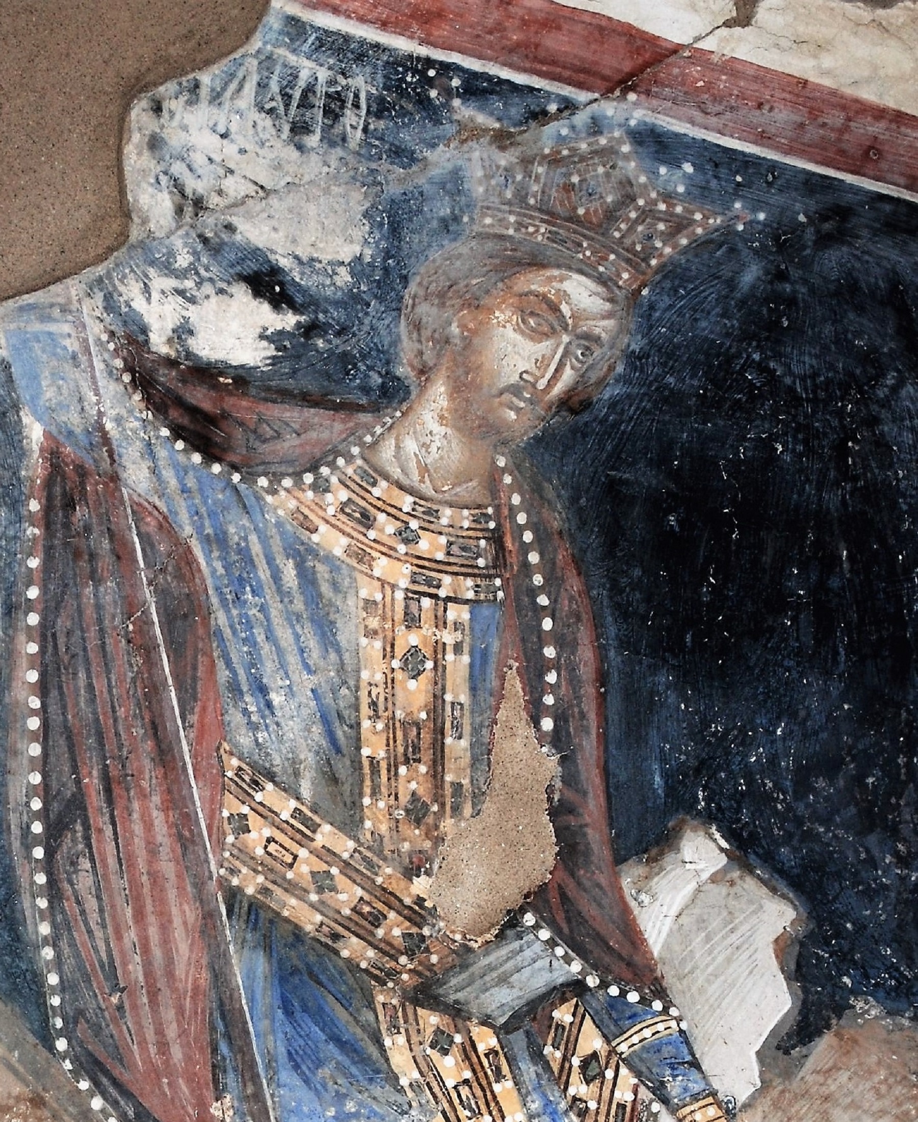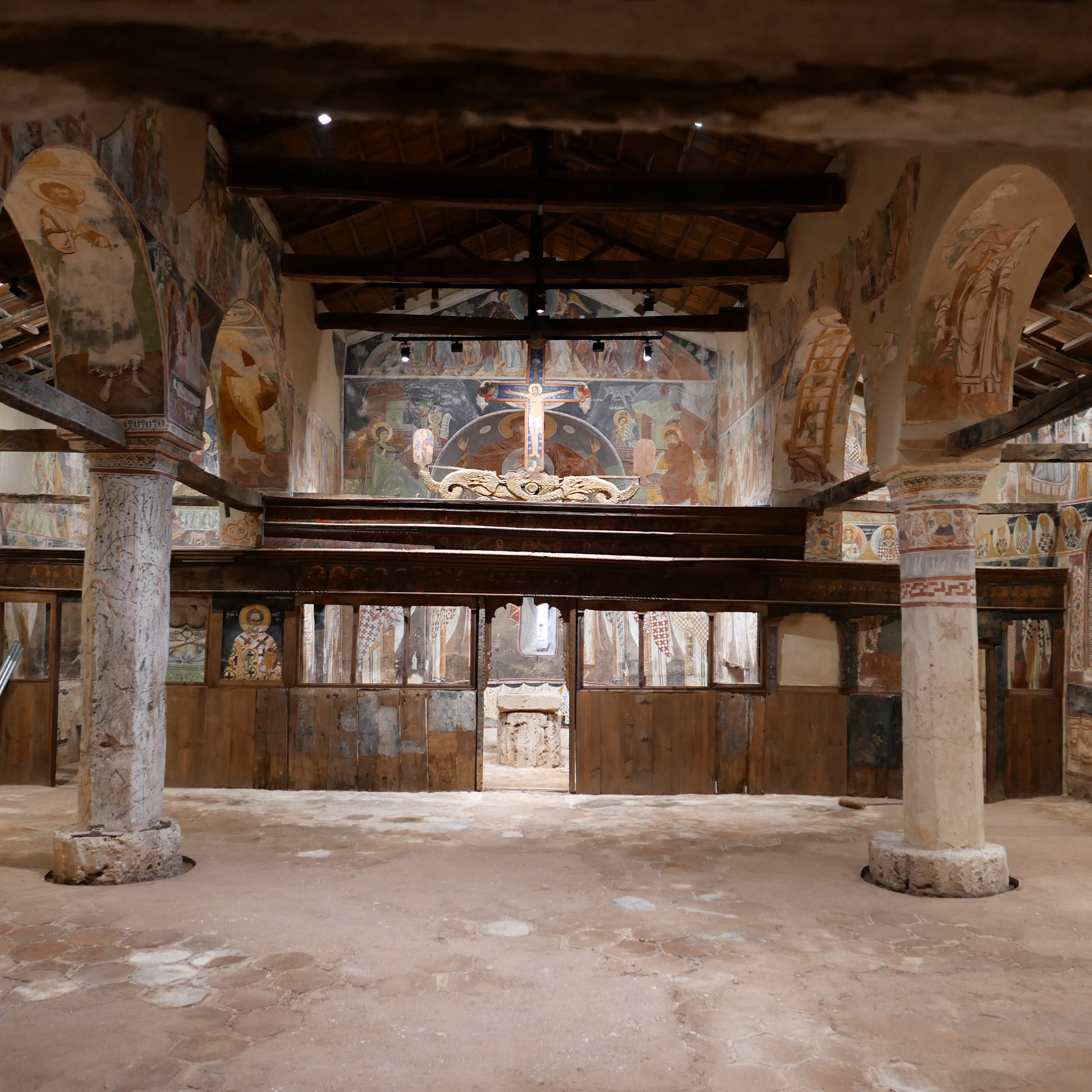 Οι συγκλονιστικές τοιχογραφίες του κατάγραφου ναού φιλοτεχνήθηκαν από το χέρι δύο ζωγράφων: Ο Νικόλαος Ζωγράφος από το Λινοτόπι εξιστόρησε στον κυρίως ναό, το έτος 1570, τον βίο του Χριστού και του Αγίου Δημητρίου, αγίους, προφήτες και μάρτυρες, την Κοίμηση της Θεοτόκου, την Πλατυτέρα των Ουρανών. Ο χρωστήρας του δεύτερου ζωγράφου μας παρέδωσε στον μεγάλο νάρθηκα μία ανεπανάληπτη Δευτέρα Παρουσία, όπου ανάμεσα στους βασιλείς της Αποκάλυψης, στο σχήμα βυζαντινού αυτοκράτορα, επιφαίνεται ο Αλέξανδρος! Τα γράμματα της επιγραφής δίπλα από το κεφάλι του δεν αφήνουν καμιά αμφιβολία. Νικητής και τροπαιούχος, ήρωας του πιο διάσημου μυθιστορήματος, ο Μεγαλέξανδρος, ώριμος άντρας πια, όπως τον είδαν οι Πέρσες, οι Άραβες και οι Βυζαντινοί, επιστρέφει επί τέλους στον τόπο, όπου νεαρό παλληκάρι ξεκίνησε το ταξίδι, τον πρώτο μήνα της Άνοιξης, δύο χιλιάδες πενήντα τρία χρόνια πριν….