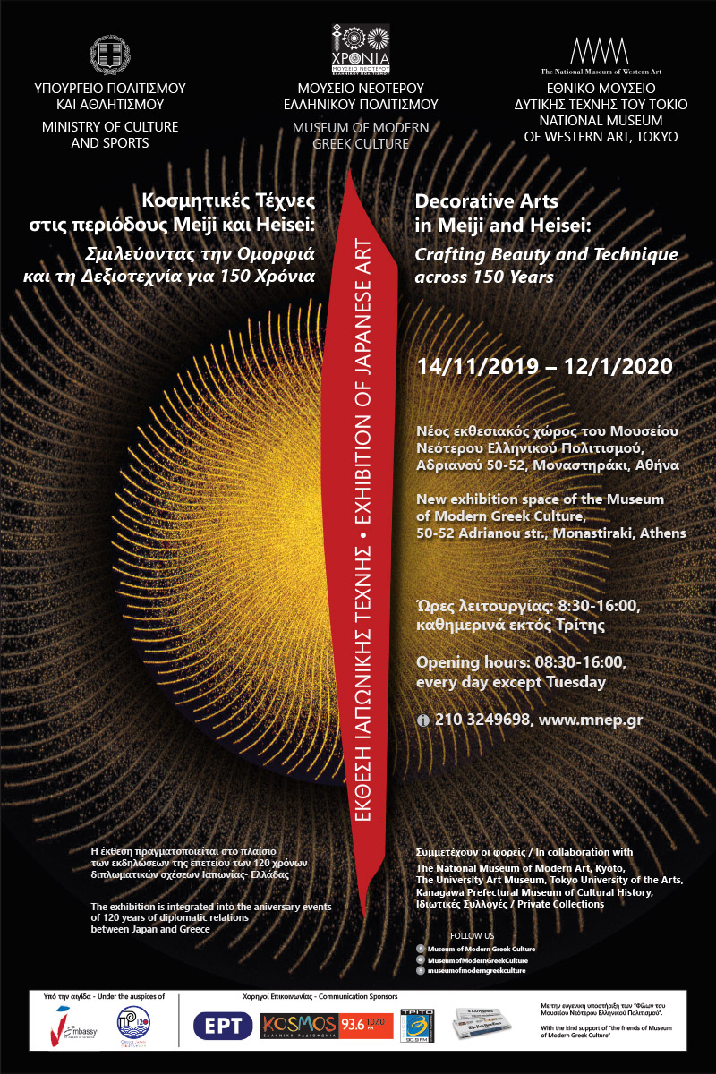 Το Μουσείο Νεότερου Ελληνικού Πολιτισμού σε συνεργασία με το Εθνικό Μουσείο Δυτικής Τέχνης του Τόκιο διοργανώνει την περιοδική έκθεση: «Κοσμητικές Τέχνες στις περιόδους Meiji και Heisei: Σμιλεύοντας την Ομορφιά και τη Δεξιοτεχνία για 150 Χρόνια».
