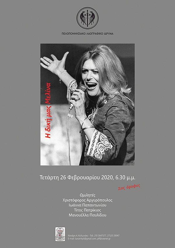 Το Πελοποννησιακό Λαογραφικό Ίδρυμα «Β. Παπαντωνίου», στο πλαίσιο του έτους «Μελίνα Μερκούρη», οργανώνει την τιμητική εκδήλωση Η δική μας Μελίνα, στον πολιτιστικό χώρο του Ιδρύματος «Κανάρη 4», στο Κολωνάκι, την Τετάρτη 26 Φεβρουαρίου, στις 6.30 μ.μ.
