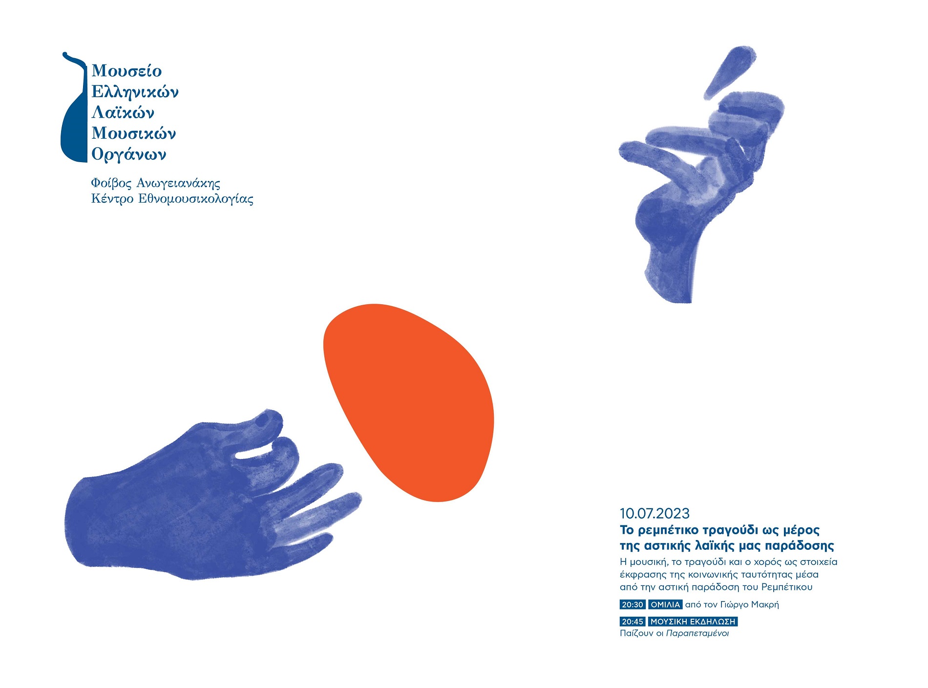 Στις 10 Ιουλίου δύο αλληλένδετες δράσεις στον κήπο του Μουσείου «μιλούν» για τη μουσική, το τραγούδι και τον χορό ως στοιχεία έκφρασης αλλά και διαμόρφωσης της κοινωνικής ταυτότητας των ανθρώπων του περιθωρίου μέσα από την αστική παράδοση του Ρεμπέτικου και μας καλούν να ακολουθήσουμε νοερά τα μονοπάτια (ανα)δημιουργίας του:
