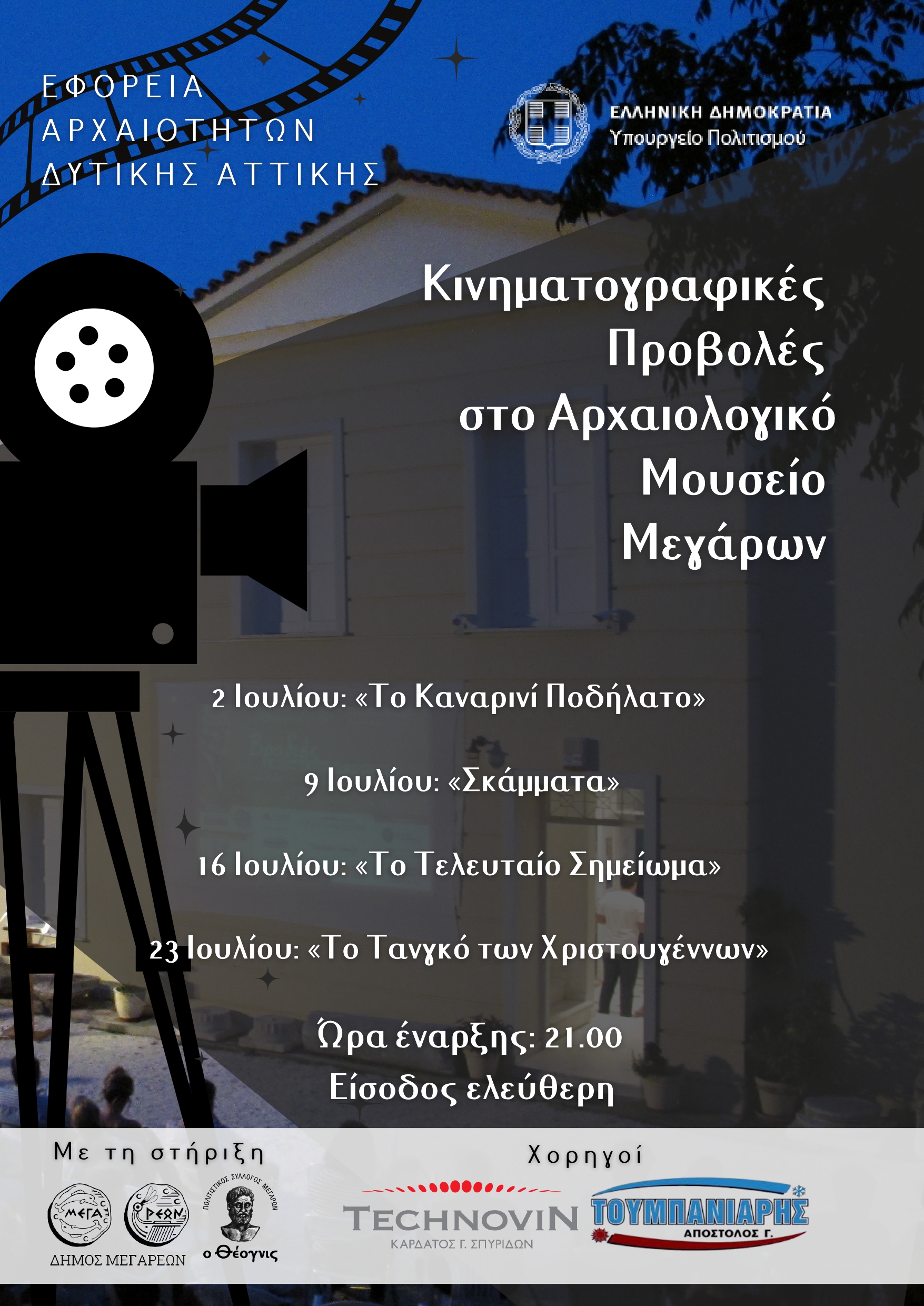 Η Εφορεία Αρχαιοτήτων Δυτικής Αττικής, με την αρωγή του Δήμου Μεγαρέων και του Πολιτιστικού Συλλόγου «Ο ΘΕΟΓΝΙΣ» διοργανώνει για 9η χρονιά στον αύλειο χώρο του Αρχαιολογικού Μουσείου Μεγάρων κινηματογραφικές βραδιές με ελεύθερη είσοδο για το κοινό.