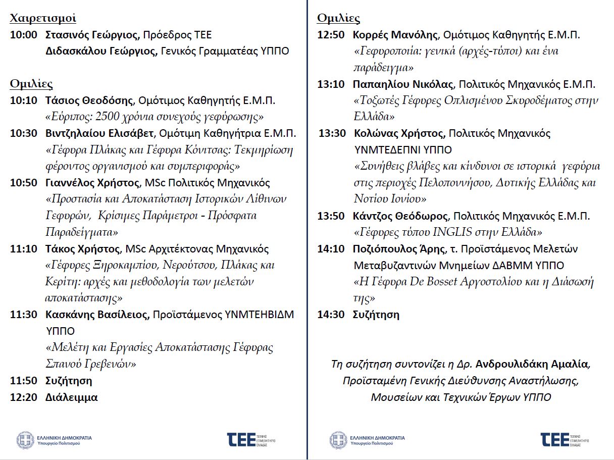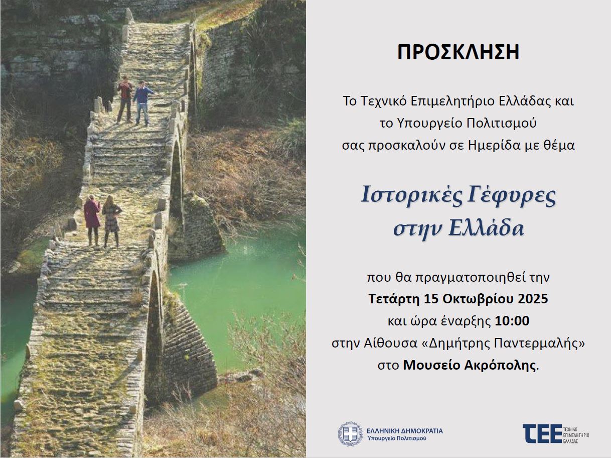 Το Τεχνικό Επιμελητήριο Ελλάδας και το Υπουργείο Πολιτισμού διοργανώνουν Ημερίδα με θέμα: " Ιστορικές Γέφυρες στην Ελλάδα", η οποία θα πραγματοποιηθεί στο αμφιθέατρο του Μουσείου Ακρόπολης «Δημήτρης Παντερμαλής», την Τετάρτη 15 Οκτωβρίου 2025 και ώρα 10:00.