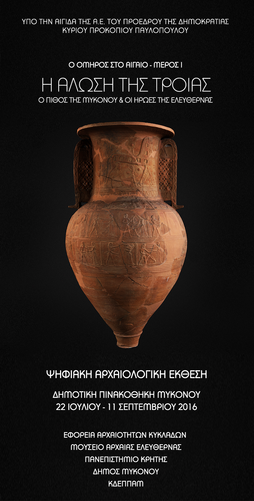 Στο πλαίσιο των πολιτιστικών δράσεων με επίκεντρο τον συμβολικό ομφαλό των Κυκλάδων, την Δήλο και την γειτονική της Μύκονο, η Εφορεία Αρχαιοτήτων Κυκλάδων σε συνεργασία με τον Δήμο Μυκόνου και το Πανεπιστήμιο Κρήτης, διοργανώνουν σειρά εκδηλώσεων με θέμα “Ο Ομηρος στο Αιγαίο” οι οποίες ξεκινούν με μία ψηφιακή αρχαιολογική έκθεση με τίτλο: “Η Άλωση της Τροίας. Ο πίθος της Μυκόνου και οι ήρωες της Ελεύθερνας”.