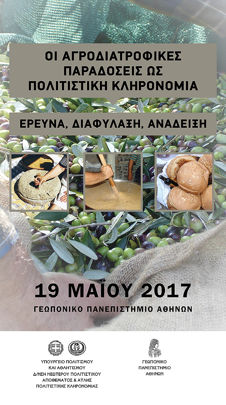 Η Διεύθυνση Νεώτερου Πολιτιστικού Αποθέματος και Άυλης Πολιτιστικής Κληρονομιάς του Υπουργείου Πολιτισμού και Αθλητισμού και το Γεωπονικό Πανεπιστήμιο Αθηνών σας προσκαλούν στην ημερίδα με τίτλο «Οι Αγροδιατροφικές Παραδόσεις ως Πολιτιστική Κληρονομιά: Έρευνα, Διαφύλαξη, Ανάδειξη» που θα πραγματοποιηθεί την Παρασκευή 19 Μαΐου 2017 και ώρα 08:30 στο Συνεδριακό Αμφιθέατρο του Γεωπονικού Πανεπιστημίου Αθηνών (Ιερά Οδός 75, ΤΚ 11855- Αθήνα, πρόσβαση: ΓΡΑΜΜΕΣ ΟΑΣΑ: 027, 856, 227, Α16).