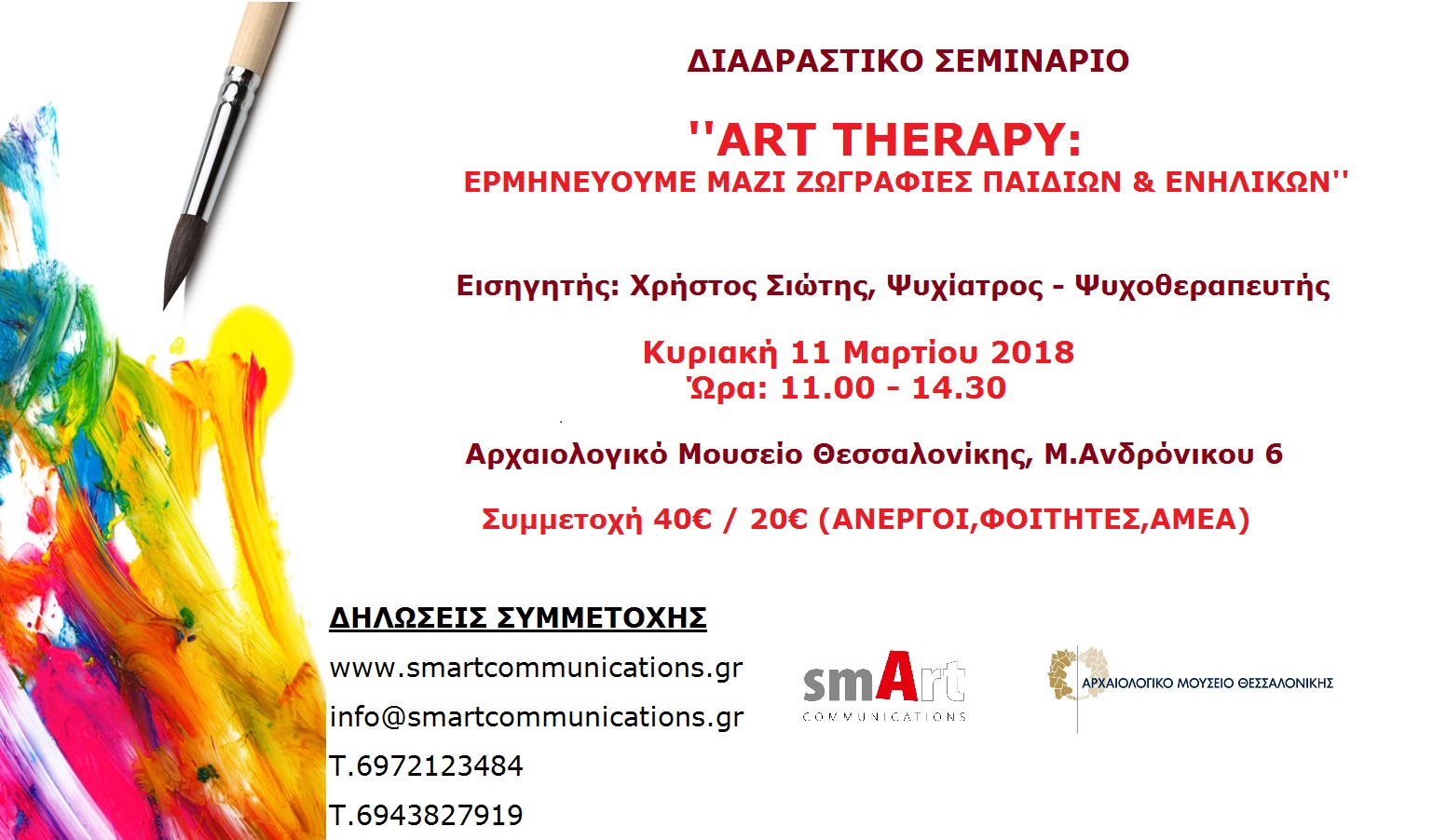 Τo Αρχαιολογικό Μουσείο Θεσσαλονίκης φιλοξενεί, την Κυριακή, 11 Μαρτίου 2018, διαδραστικό σεμινάριο που διοργανώνει η smART–communications με τίτλο: "Art Therapy: Ερμηνεύουμε μαζί ζωγραφιές παιδιών και ενηλίκων". Εισηγητής του σεμιναρίου είναι ο κ. Χρήστος Σιώτης Ψυχίατρος-Ψυχοθεραπευτής.